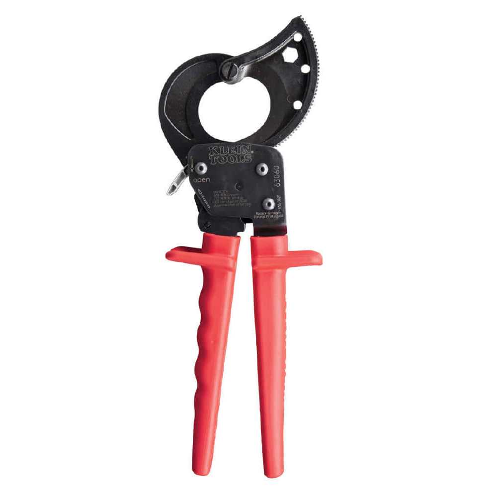 Higher cutting capacity and reduced hand force for easier cutting of large diameter cables Patented two-step ratchet mechanism requires fewer strokes per cut Cuts up to 600 MCM Copper and 750 MCM Aluminum Quick release lever opens blades easily in every cutting position, to allow removal of the cable before completion of cut Hardened steel cutting blades for lasting strength and sharpness Locking lever keeps handles closed for easy transport; fits in a tool box or bag Cable Cutter Replacement Part List available for reference if needed For cutting copper wire up to 600 MCM and aluminum wire up to 750 MCM, use the Klein Tools Ratcheting Cable Cutter. This cutter features a hold-open spring that allows for rapid cutting while the quick-release lever permits the blade to open as the tool is being used. This premium hand tool is made in Germany.