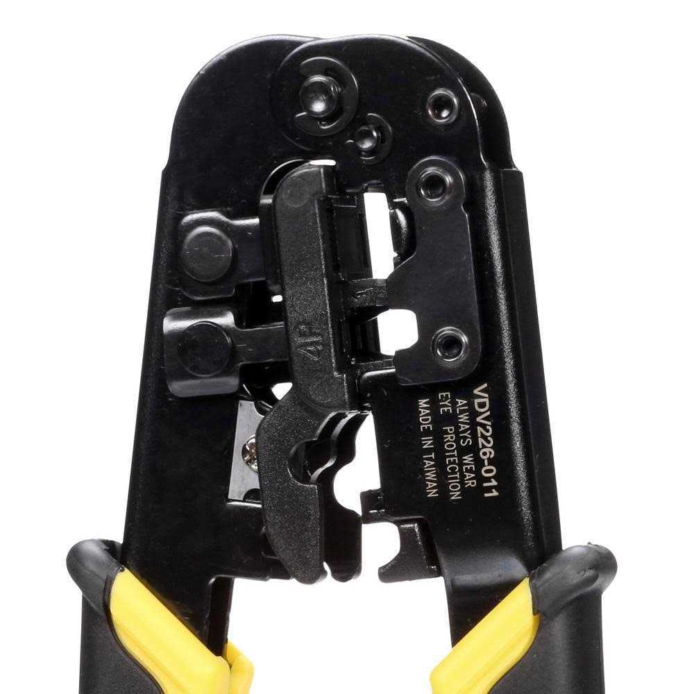 A fast and reliable installation tool for a variety of voice and data applications. Cuts, crimps and strips paired conductor cables like round STP/UTP and flat-satin phone cable. Crimps 4,6 and 8 position RJ22, RJ11/12 and RJ45 modular connectors.