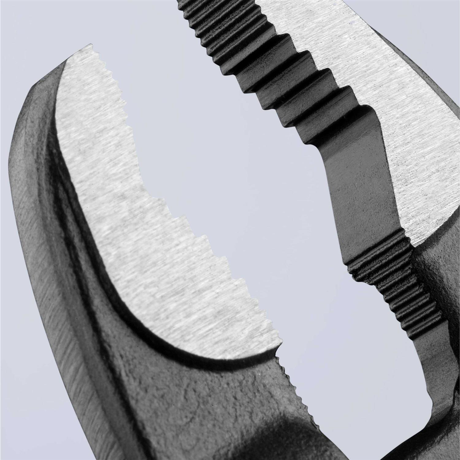 No more time-consuming test-adjusting to achieve the correct size. With the Knipex Cobra water pump pliers, you can simply position the upper jaw to the workpiece, push the button, and close the lower jaw. And you’ll also be able to say goodbye to blood blisters you get with other gripping pliers. With safety its first priority, Knipex has designed a built-in pinch guard that prevents blood blisters on your hand. The unique self-locking adjustment and induction hardened gripping teeth mean that once it’s set, it stays. There’s no slipping and no need to waste strength squeezing the pliers ensuring operator safety and more efficient work. Cobra’s unique jaw configuration can grip any shape object flat, round, hex, or square. It also eliminates nut burring to avoid stripping pipes, nuts, or bolts. Additionally, the Cobra’s newly redesigned adjustment provides 30 percent more gripping capacity than previous models. A simple push of the patented push button adjustment maintains jaw size setting and gives you the correct size opening every time. Just position the upper jaw to the workpiece, push the button, adjust the opening, and close the lower jaw. And it’s easily done with just one hand for trouble-free operation in confined spaces. Cobra water pump pliers are constructed from chrome vanadium electric steel, an innovative high alloy, oil tempered steel that ensures longevity. And their thin head design helps you get into spaces other pliers can’t, so there’s no need to change tools when working in tight confines.