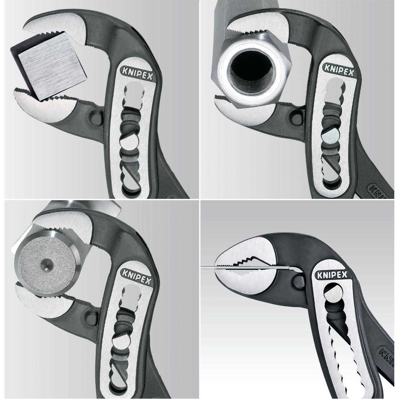 Providing more output and comfort compared to conventional water pump pliers of the same length, the KNIPEX Tools Alligator water pump pliers offers nine adjustment positions for 30 percent more gripping capacity and good access to the workpiece due to the slim size in its head and joint areas. It’s so versatile, it can be used in any industry — automotive, electrical, HVACR, industrial, and even for DIY. A serrated gripping surface on the jaws allows for gripping any shaped object — round, square, hex, or flat. Plus, the tool’s teeth are induction hardened for wear resistance and a longer life. A box joint provides directional stability when working in any environment. This dual channel design offers the operator increased confidence that the tool will not bend or break under heavy duty working conditions. A fine adjustment enables you to find the perfect setting for different sized workpieces. By adjusting the handles to get the appropriate width, you can lock the jaws into place to avoid slipping off the workpiece. Once locked into position, you won’t have to squeeze the handles to get a greater grip. Only downward pressure on the top handle is needed to firmly hold the object. The Alligator also has a forged on pinch guard that prevents the operator’s fingers and hands from being pinched. Because the guard is forged at the same time that the tool is made, it will last as long as the tool itself.