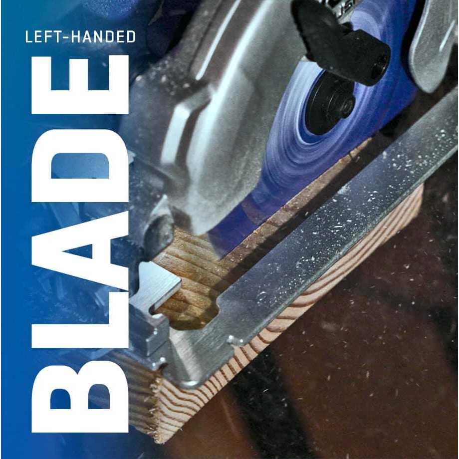 The Kobalt 6-1/2-In Circular Saw features the latest innovations in electronics and brushless motor technology to deliver a high performing saw in a compact size. The saw features a left hand blade configuration for clear line of sight to the blade, maximizing the user’s productivity and accuracy. The saw features an quick-depth blade adjustment mechanism which allows the user to make fast adjustments when cutting various material thicknesses allowing the user to work faster between cuts. The durable helical gear design is backed by the powerful brushless motor which produces up to 5500 RPM, delivering the torque to tackle many applications such as carpentry, framing, and finish work. It is equipped with an electric brake to stop the blade quickly after the trigger is released to maximize battery runtime and reduce risk making accidental cuts. The compact structure, aluminum upper and lower guard, and aluminum shoe make this a lightweight saw, great for all day use. The saw has a 0-50 degree bevel capacity along with 2-3/16-inch depth of cut at 90 degrees and 1-5/8-inch depth of cut at 45 degrees. It includes several premium features such as a rafter hook, LED light, and improved blade. The dust port is located on the right side of the guard to push dust away from the user and cut line and the dust port adapter is 1-1/4-inch diameter and connects to most vacuums such as the Kobalt 24v WDV (model #KMDV 0124B-03).