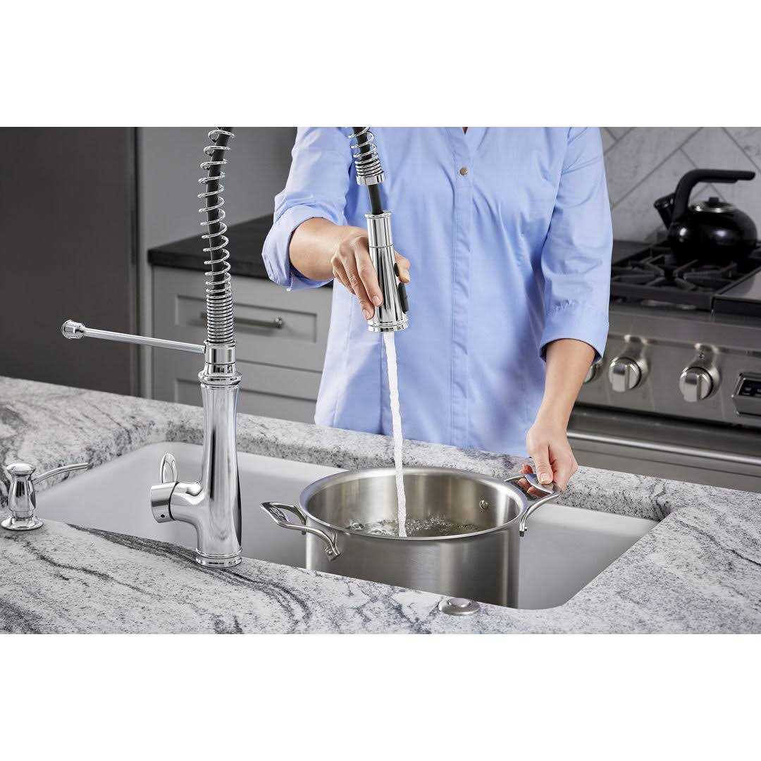 Distinguished by an elegant silhouette, this Bellera pull-down faucet brings professional-level style and performance into home kitchens. The high-arch spout with an industrial-inspired spring coil design swivels 360 degrees for a complete field of reach. A three-function sprayhead with touch control pulls down into the sink for powerful cleaning with Sweep spray, or out of the sink to fill pots and pitchers quickly with Boost function.Product Features: Metal pop-up drain with tailpiece. 6-5/8 (168 mm) spout reach. Includes stationary spout with aerator and pop-up drain with 1-1/4-inch tailpiece. Handles sold separately. Laminar flow delivers a graceful stream while conserving water. 1.2 gpm (gallons per minute) flow rate. Coordinate with your choice of Artifacts handles for a personalized design.