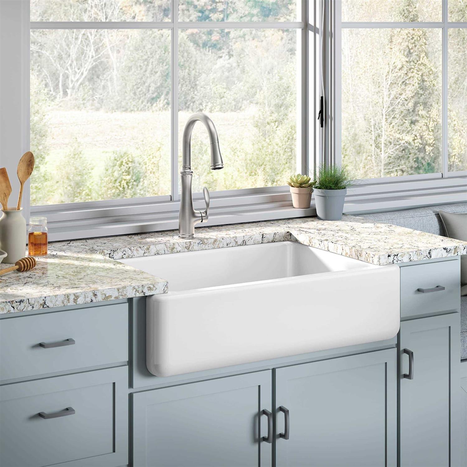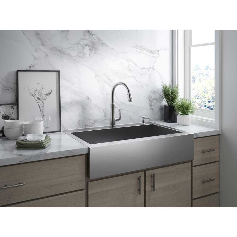 With its sleek look and innovative features, this Bellera pull-down kitchen faucet combines an elegant, versatile design with exceptional ergonomics and functionality. The high-arch spout rotates 360 degrees and reaches over the tallest pots, while the compact, three-function sprayhead pulls down into the sink for up-close tasks, or out of the sink to fill pots. Sweep spray creates a wide, forceful blade of water for superior cleaning. Kohler’s new docking system, DockNetik, secures the pull-down sprayhead to the spout using magnetic force.