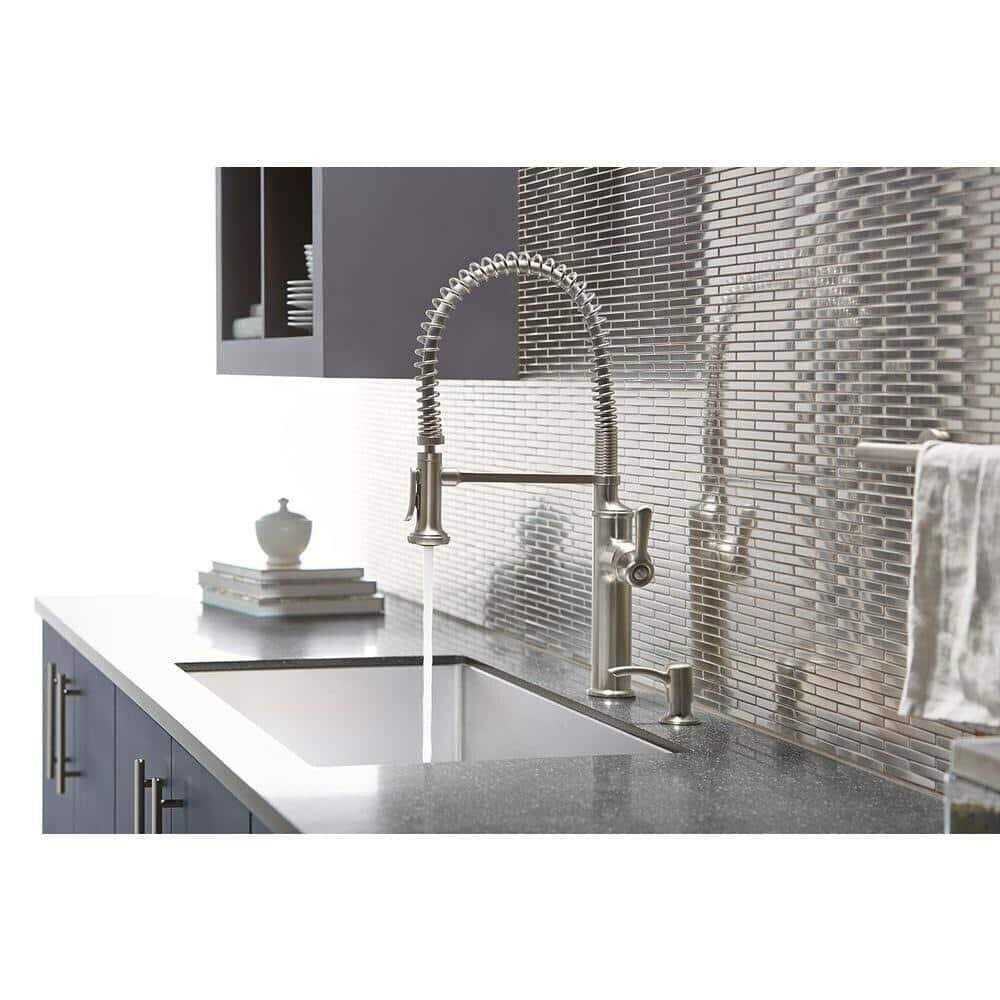 Inspired by the design of professional kitchens, the Sous pull out kitchen faucet will bring to life your inner chef. It includes assembled faucet, 29-1/2 in. supply lines, soap/lotion dispenser, and deck plate. Its high arch and unique exposed-spring design exceptional control and flexibility.