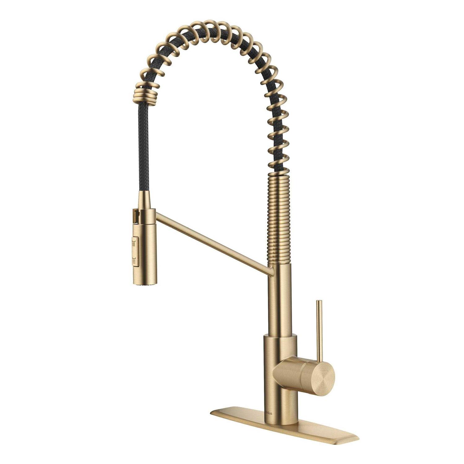 Instantly modernize your kitchen with a unique pull-down commercial design that combines the look of a professional faucet with the convenience of a pull-down sprayhead for a wide range of motion all around the sink. The heavy-duty open-coil spout adds an industrial touch for a highly desirable modern look. QuickDock mounting technology allows for fast and easy topmount installation, so you can install this faucet in a matter of minutes from above the kitchen counter, with no need to go under the sink. Top-quality components include a drip-free ceramic cartridge, and an eco-friendly aerator that reduces water waste without sacrificing pressure. Easy-clean rubber nozzles eliminate hard water build up, for a long-lasting powerful flow. Chrome finish combined with commercial styling offers an elegant highlight that will enhance the look of your sink.