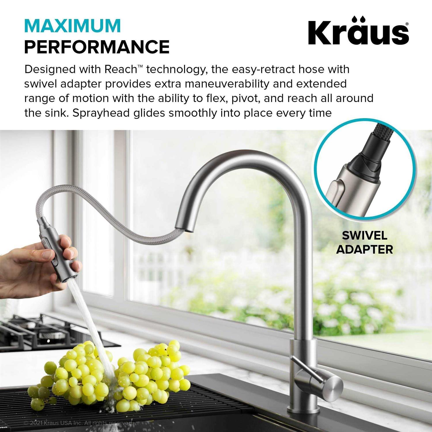 New from Kraus, the Oletto Pull-Down Faucet is memorable for its clean, minimalist design and universal appeal, making it an easy choice for any kitchen. Great for even the smallest kitchens, the high-arc spout offers maximum space for large pots and even tall pitchers. The Oletto Kitchen Faucet from Kraus was designed for ease of use which is highlighted by the ergonomic handle’s 90 degree forward rotation. The Oletto also includes a dual function pull-down sprayer with swivel adapter which allows for a wide range of motion, meaning you get the most out of your kitchen. The Oletto Kitchen Faucet from Kraus is made from lead-free solid brass and a ceramic cartridge engineered to last twice as long, ensuring durability and longevity. Installing the Oletto Kitchen Faucet is seamless and headache-free with flexible pre-attached water lines and QuickWeight snap-on counterweight. The Oletto Kitchen Faucet by Kraus comes in a variety of heights and finishes allowing you to tailor your faucet to fit your unique style.