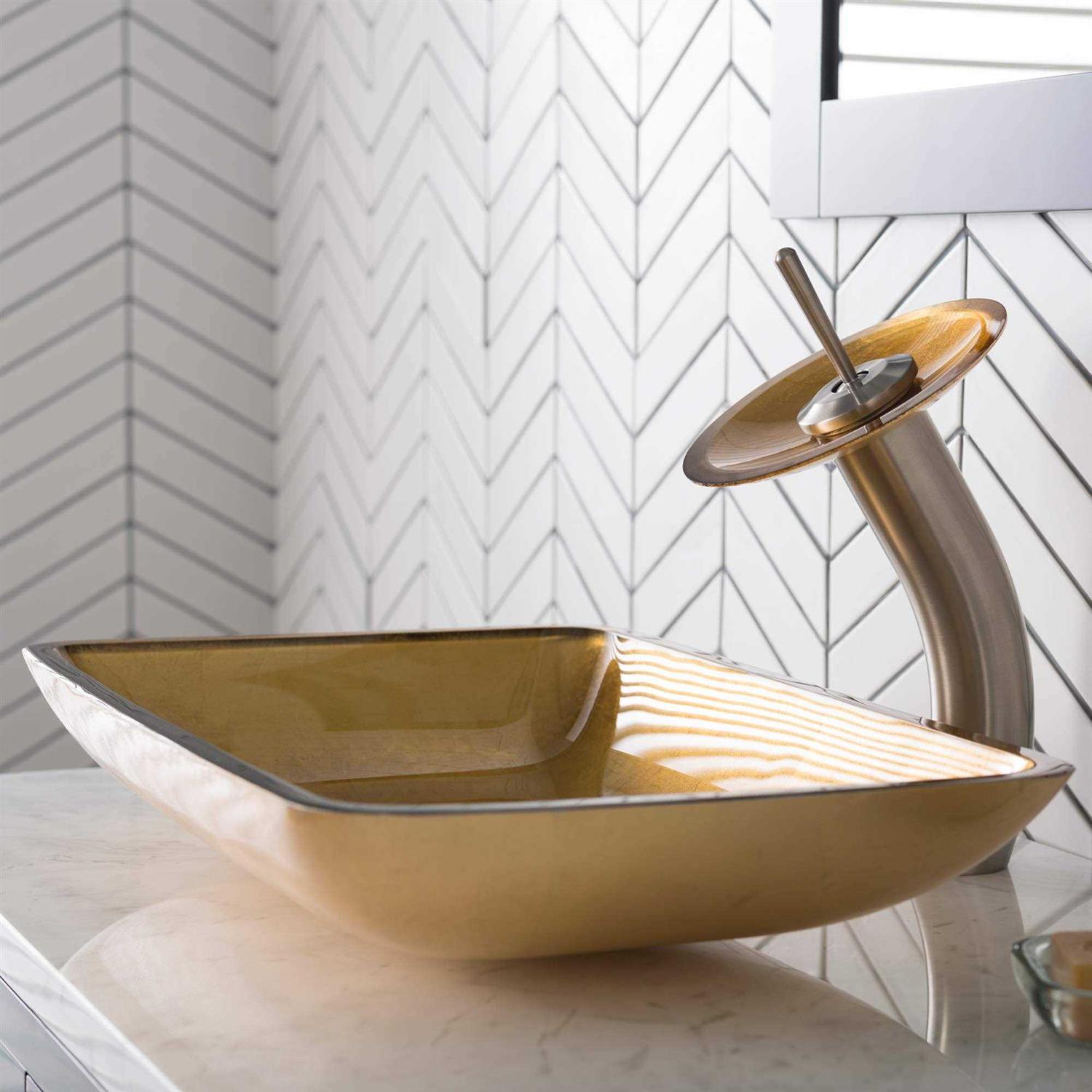 Kraus C-GVR-210-RE-10SN Golden Pearl Rectangular Glass Vessel Sink and Waterfall Faucet Satin Nickel