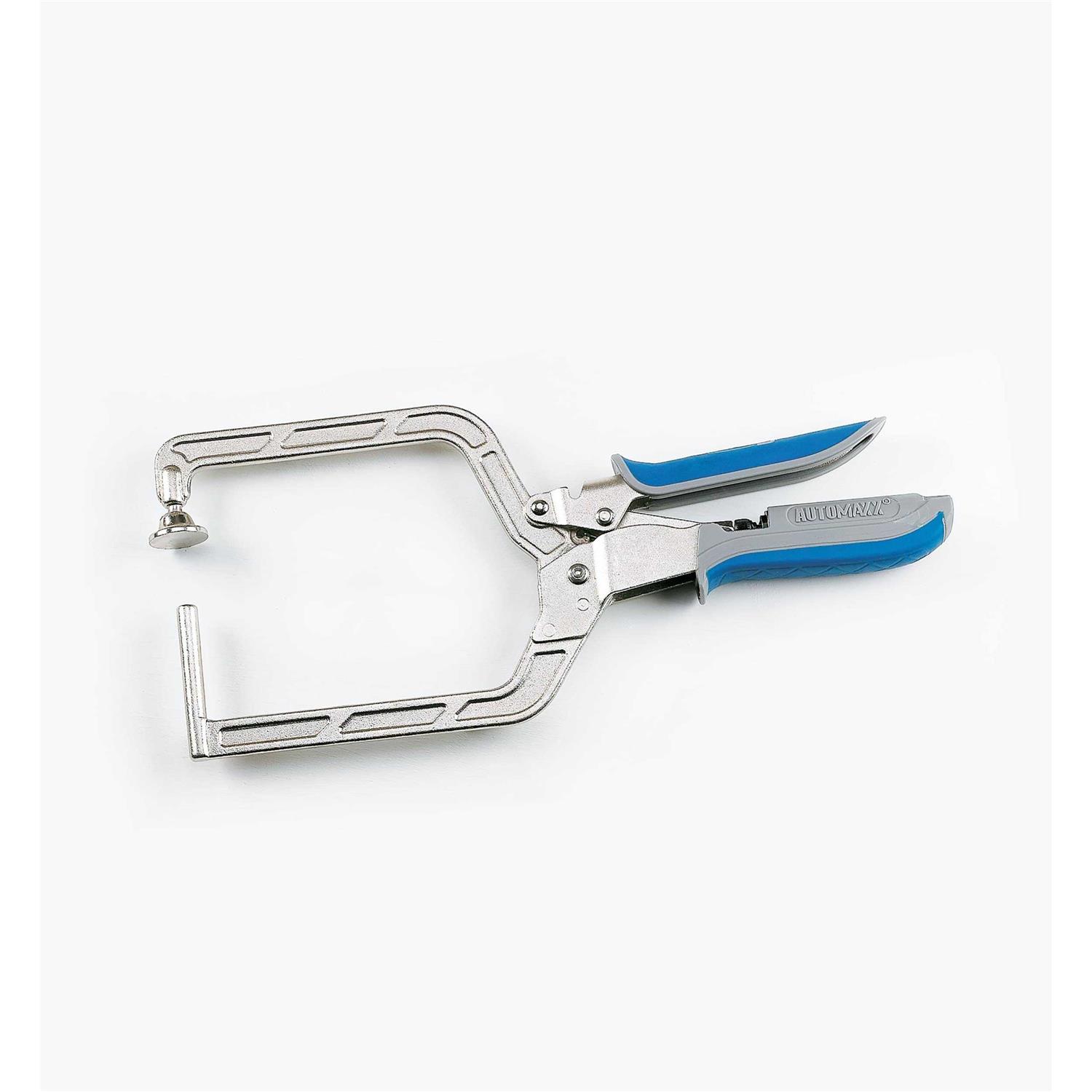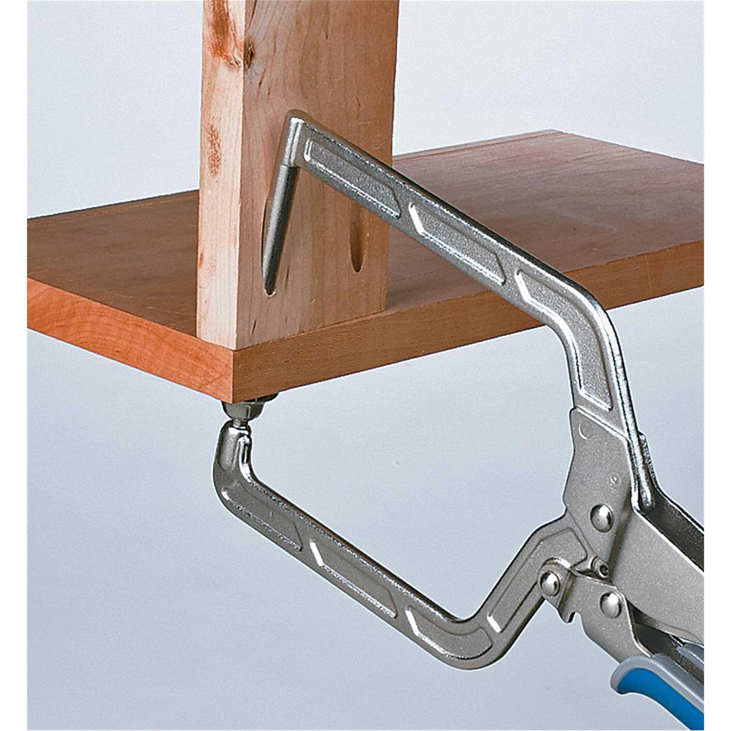 The Right Angle Clamp makes projects with 90 joints faster and easier than ever by giving you the helping hand you need to hold the parts in position as you drive in the screws. Just slip the pin on the Right Angle Clamp into a pocket hole, close the clamp, and it draws the mating pieces tightly together. The swiveling clamp pad opposite the pin grabs the mating piece securely. Thanks to Automaxx auto-adjust technology, the Right Angle Clamp adjusts to match the material automatically with a simple squeeze of the handles. This handy clamp works with all kinds of materials, from thin 12 plywood to thick 24 boards. Clamp Using the Pocket Hole The steel pin on this clamp is shaped to fit snugly into a pocket hole, securely anchoring one workpiece against the other for easy assembly. Just drive a screw into an adjacent pocket hole while the Right Angle Clamp holds the piece steady for you. Swivel Pad for Solid Clamping The arm opposite the pin features a pad that swivels to fit tight against your material, so you can count on solid clamping without a chance of the joint shifting. Ultra-Wide Reach Whether youre joining two thin drawer sides for a cabinet, or thicker materials to frame an outdoor project, the Right Angle Clamp opens wide to get the job done. Use One Clamp, or Use Two Many woodworkers find it handy to use two Right Angle Clamps when assembling large workpieces. Place a clamp on each end to hold the wood while you drive screws in the remaining pocket holes.