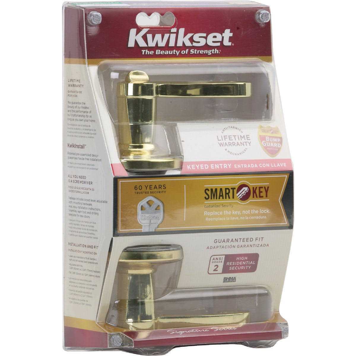 - Polished brass Lido keyed entry door lever featuring SmartKey Security for exterior doors where keyed entry and extra security is needed