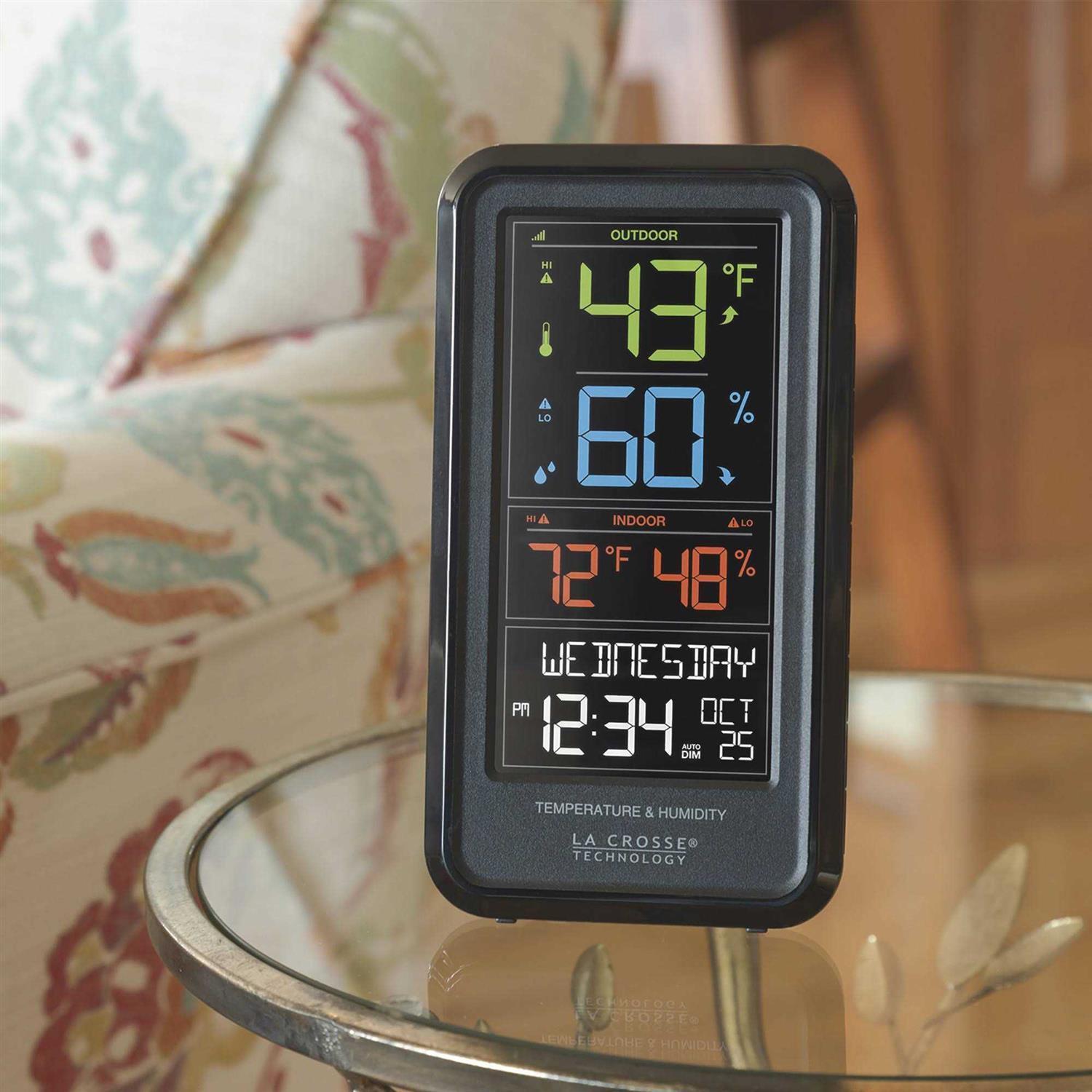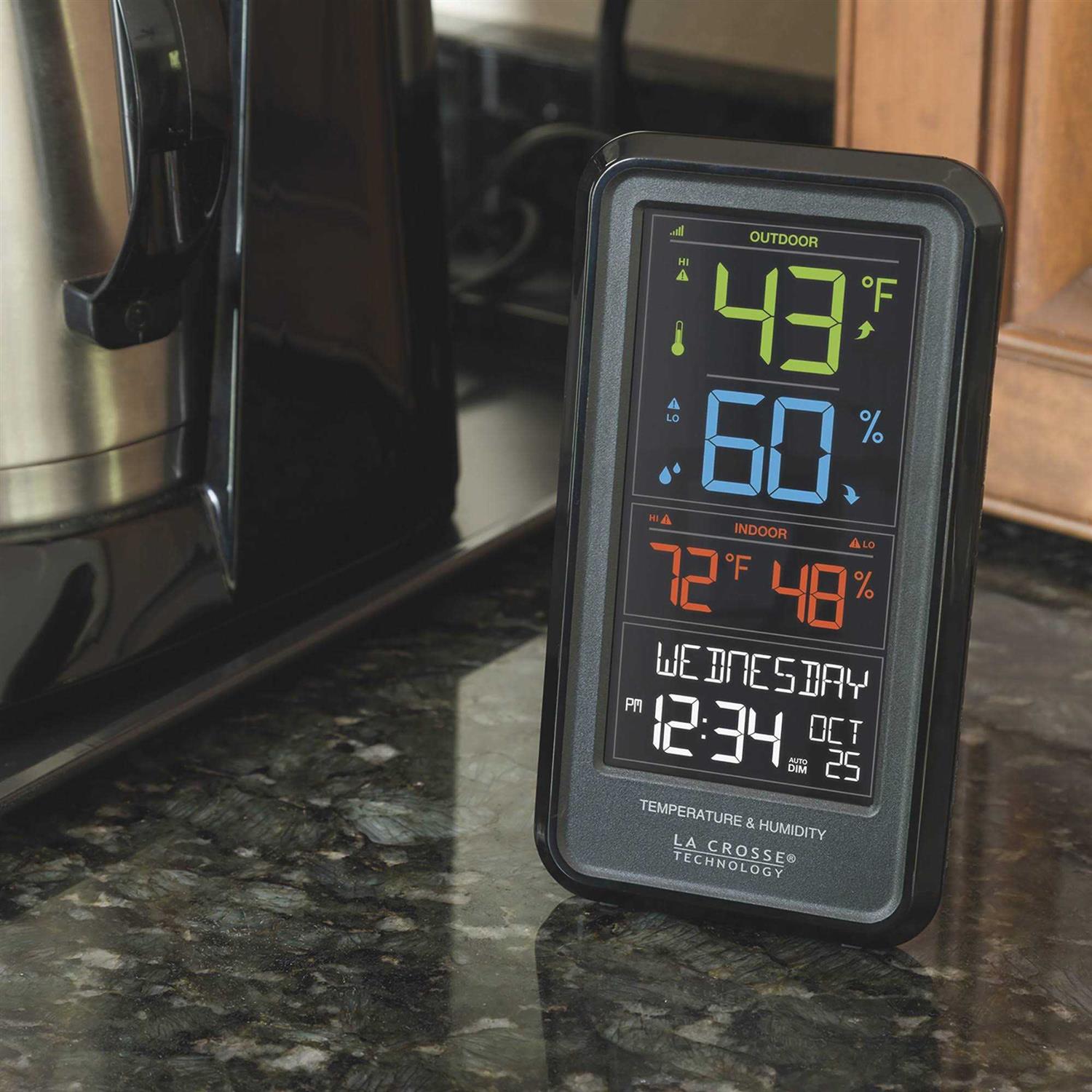 Your home’s personal meteorologist is now right at your fingertips! Check your backyard temperature and humidity while getting ready for work with La Crosse Technology’s wireless color weather station. Be informed of extreme changes in the climate with its programmable temperature alerts and recorded history with time and date stamp. Audio and visual warning icons detects when the preset value is reached. Display current heat index and dew point. Features full calendar view and multi-color dynamic display and trends. Requires (included) AC adapter cord and can add 2 AA alkaline batteries for back up due to power loss. Included weather resistant wireless temperature and humidity sensor transmits over a 300 ft. range. Versatile display can stand on table or hang on a wall and display with 12/24 hour view. Also features auto-dimming option to adjust the backlight settings to your desired level. Indicators will display when batteries are weak and should need to be changed.