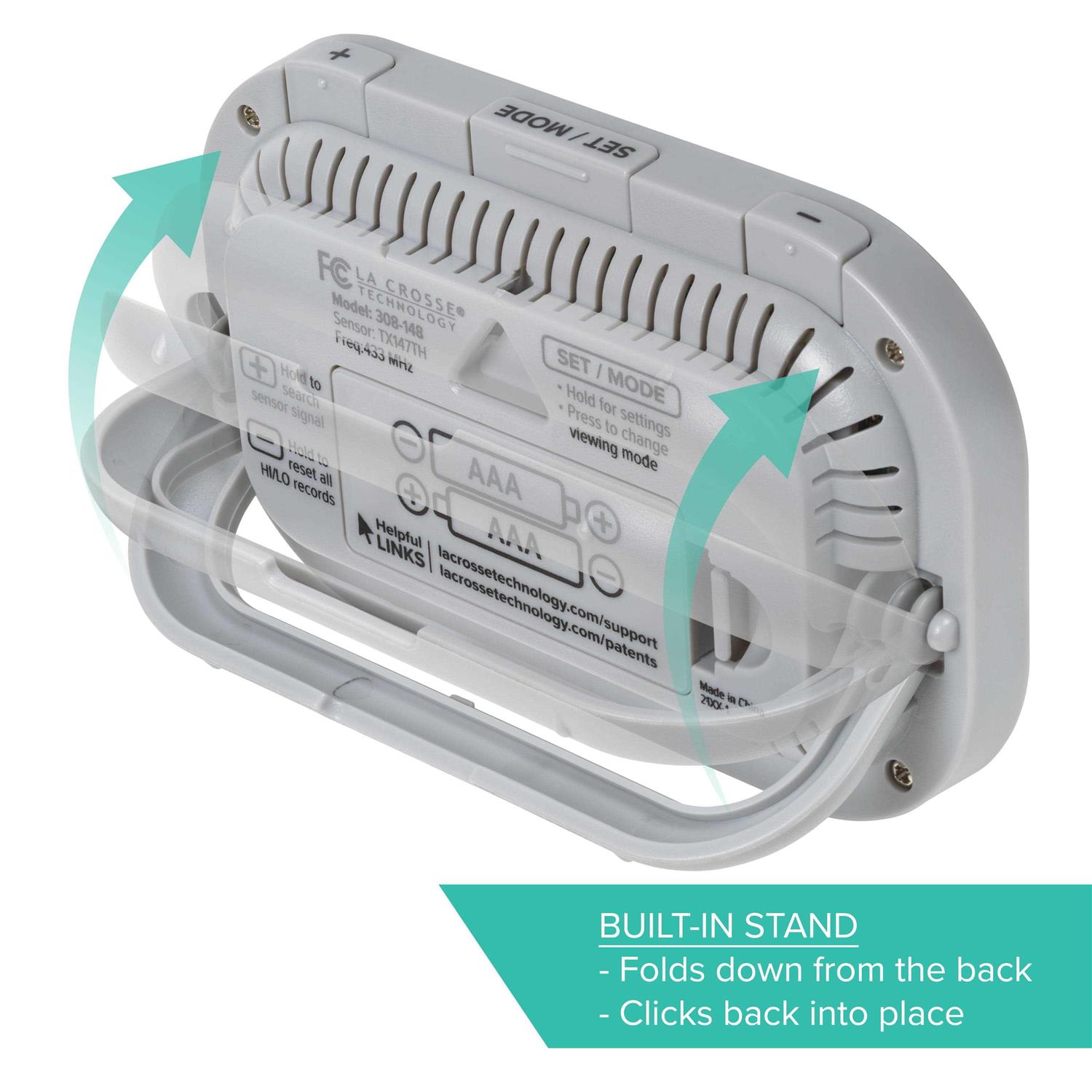 La Crosse Technology brings you the Wireless Temperature and Humidity Station. Monitor your indoor and outdoor environments and track highs and lows. The compact and stylish display features a colorful background on an easy-to-read LCD. A sturdy foldable stand is perfect for tabletops or optional wall-mount with its keyhole bracket. Its compact size displays the current date and time, as well as indoor and remote outdoor temperature with humidity. Choose your display, by selecting either large humidity or large temperature numbers to be prominent. Includes modern-day designed Thermo-hygro sensor to easily fit any area you would like to monitor; outdoors, basement, attic, freezer, refrigerator, humidor, and more. It offers a 330-foot wireless range (without obstructions) and detects temperatures down to -40°F, updating the display every 51 seconds. Battery operated and designed in La Crosse, Wisconsin.