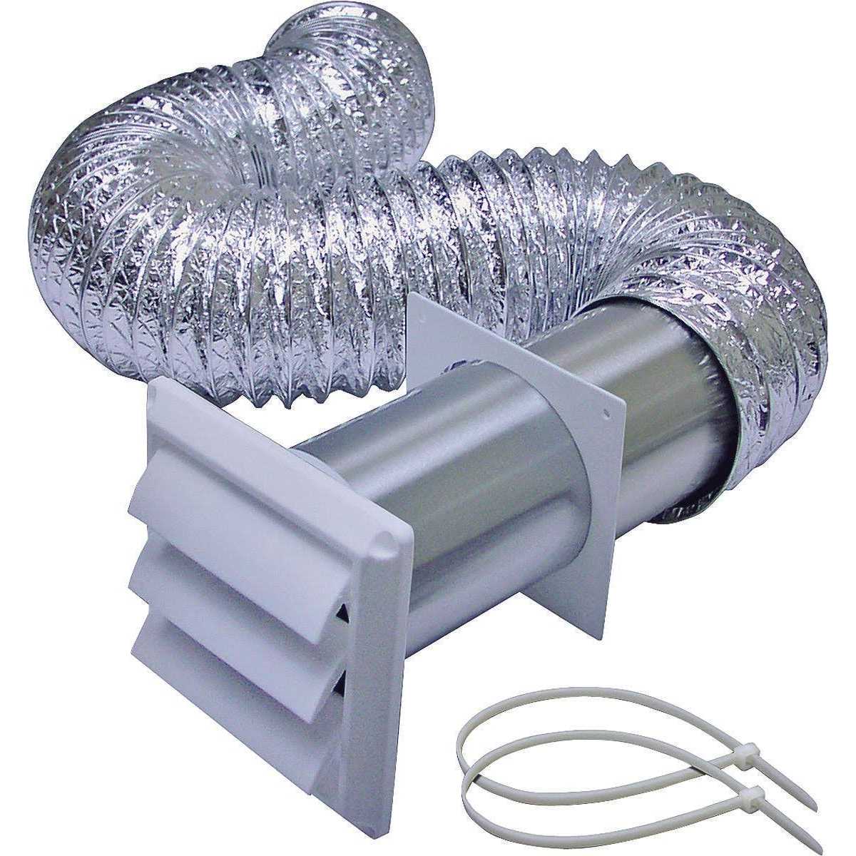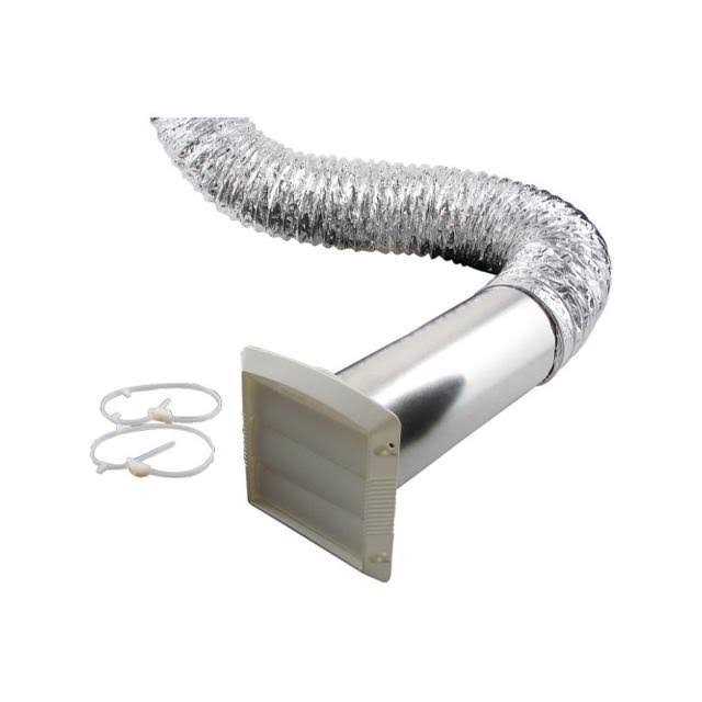Includes (1) louvered vent with tail pipe, (1) UL listed laminated transition duct, (1) trim plate and (2) tension clamps. Opening/closing flaps prevents outside elements from entering the vent. Opening/closing flaps prevents outside elements from entering the vent. Flexible laminated foil design for easier installation. UV inhibitor is used to prevent the premature fading of vent. Louvers prevent outside elements from entering.
