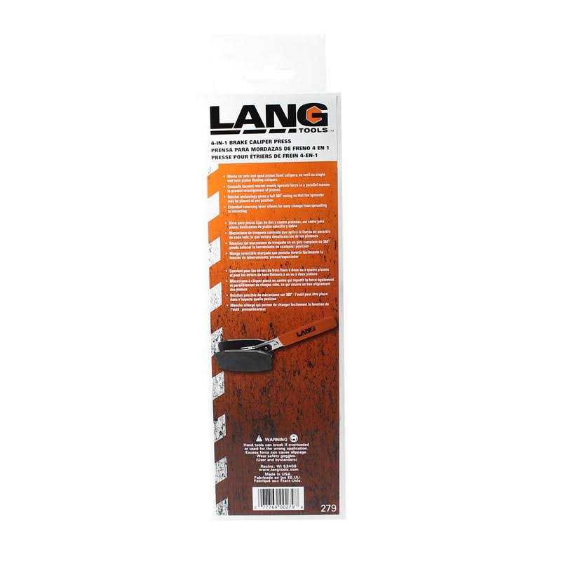 Made in the USA, Lang Tools (279) Brake Caliper Press allows you to work on various single, dual and quad piston calipers. With an extended reversing lever it allows for an easy change from spreading to retracting. The 360 degree ratchet swing gives access at any angle. Works on twin and quad piston fixed calipers, as well as single and twin piston floating calipers Centrally located ratchet evenly spreads force in a parallel manner to prevent misalignment of pistons Ratchet technology gives a full 360 degree swing so that the spreader may be placed at any position Extended reversing lever allows for easy change from spreading to retracting Made in the USA Fully retracted: 1-1/2”, Fully expanded: 3”