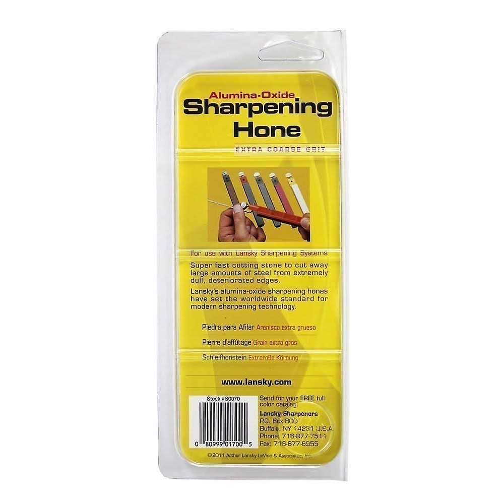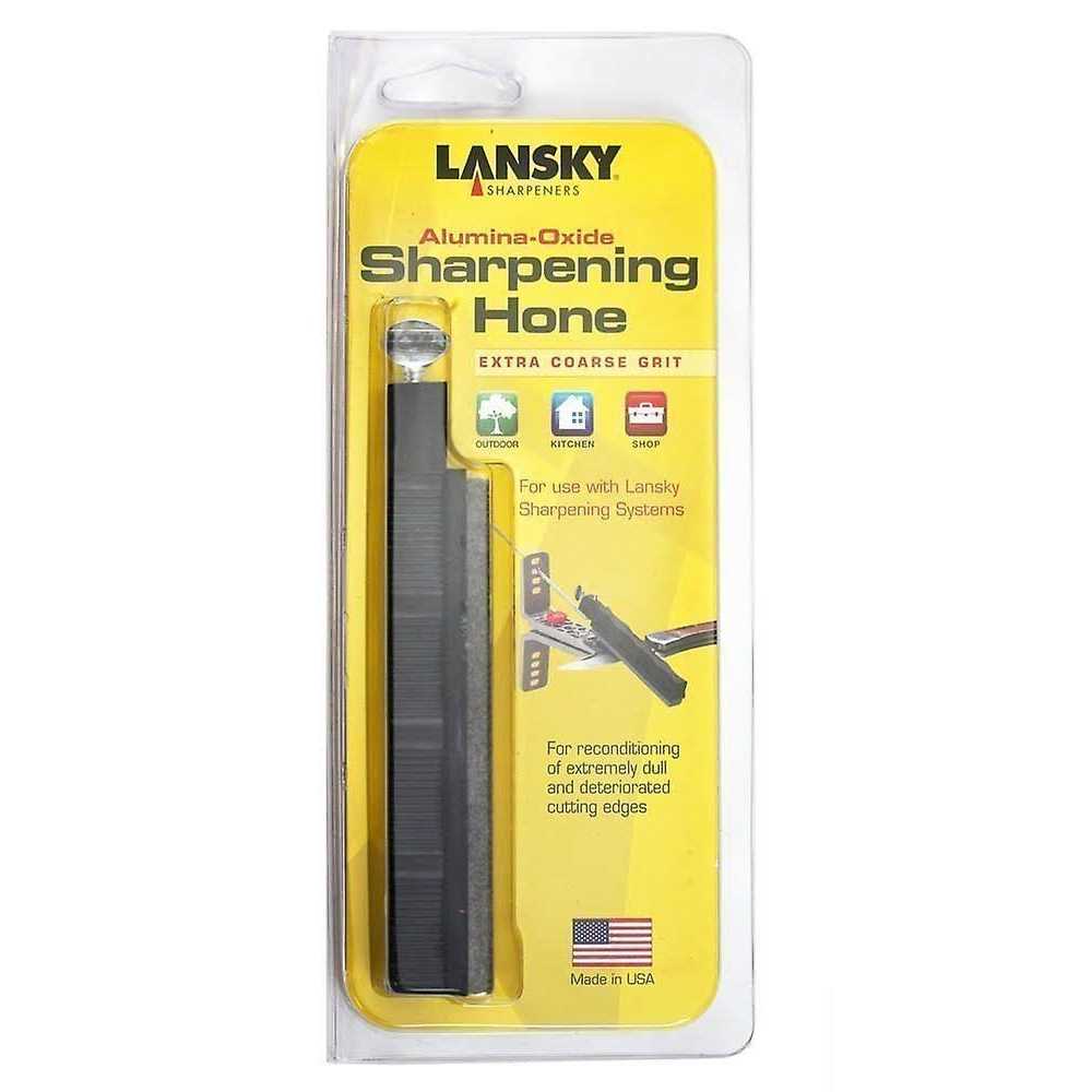 Extra Coar se Sharpening Hone Lansky A great accessory for a extreme knife user’s Lansky Sharpening System. This 70 grit Alumina-Oxide Hone lets you reshape and repair heavily chipped and damaged edges. Key Features extra coarse alumina-oxide hone 70 Grit threaded brass insert for stainless steel screw ergonomic plastic housing made in the USA intended for use with the Lansky Controlled Angle Sharpening Kits Instructions Insert the guide rod into the hone. Make sure the rod is in line with the sharpening surface. Bend the rod slightly, if needed. Set the angle to the same one pre-established on your knife. Sharpen away!