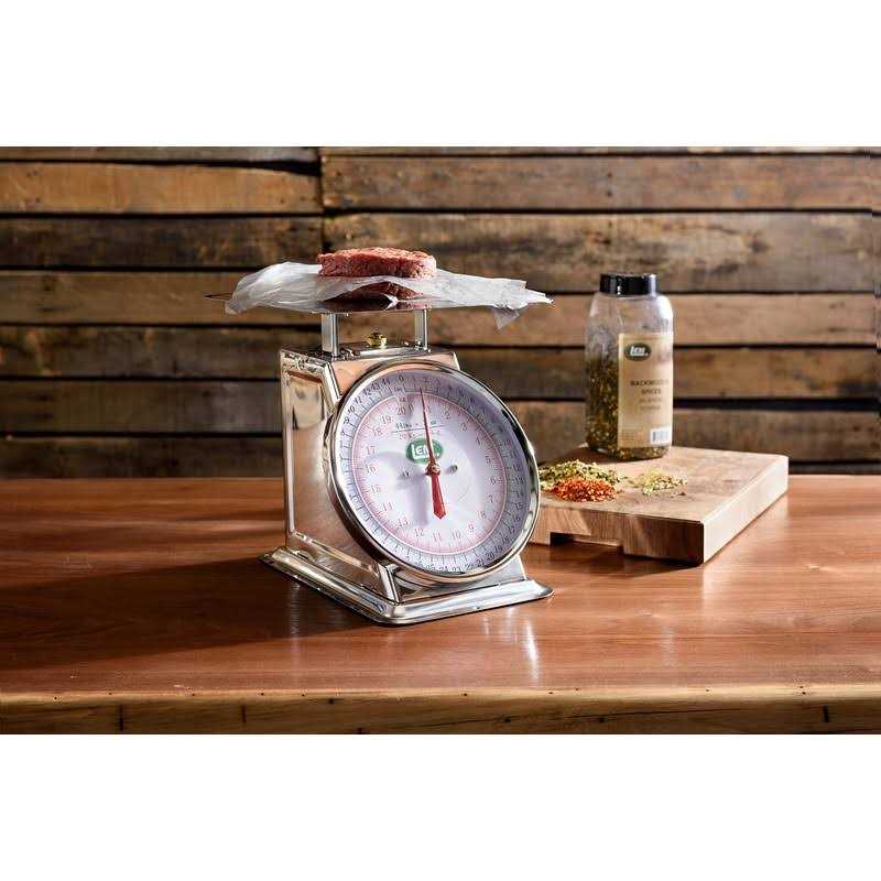 Prepare foods more efficiently using the LEM scale. It features a large platform and a dial that’s easy to read. This heavy-duty kitchen scale is designed to weigh items up to 44 lbs. It is crafted from stainless steel for lasting use. This kitchen tool measures pounds in 2 oz increments as well as kilograms in 50g units. It weighs only 5 lbs making storing it on a shelf or transporting it around easy. This durable scale’s stainless steel platform base offers additional support. It can also be used for a variety of other applications such as fishing hunting scavenging auto repair electronics repair and more.
