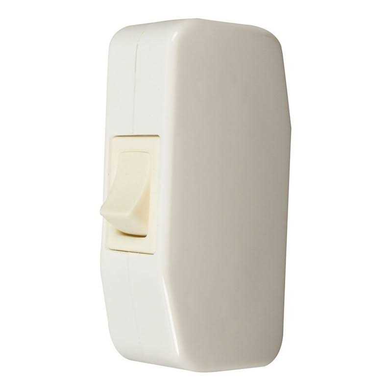 Leviton Heavy duty feed through cord switch in white color, has thermoplastic construction for added durability. The 1-Pole switch with rocker actuator, has a voltage rating of 125-Volts AC and current rating of 3-Amps. It features SPST contact configuration. This ON/OFF switch measures 2.5-Inch x 0.84-Inch x 1.22-Inch. It is suitable for residential and industrial use. Switch meets UL, CSA and NOM 057 standards.
