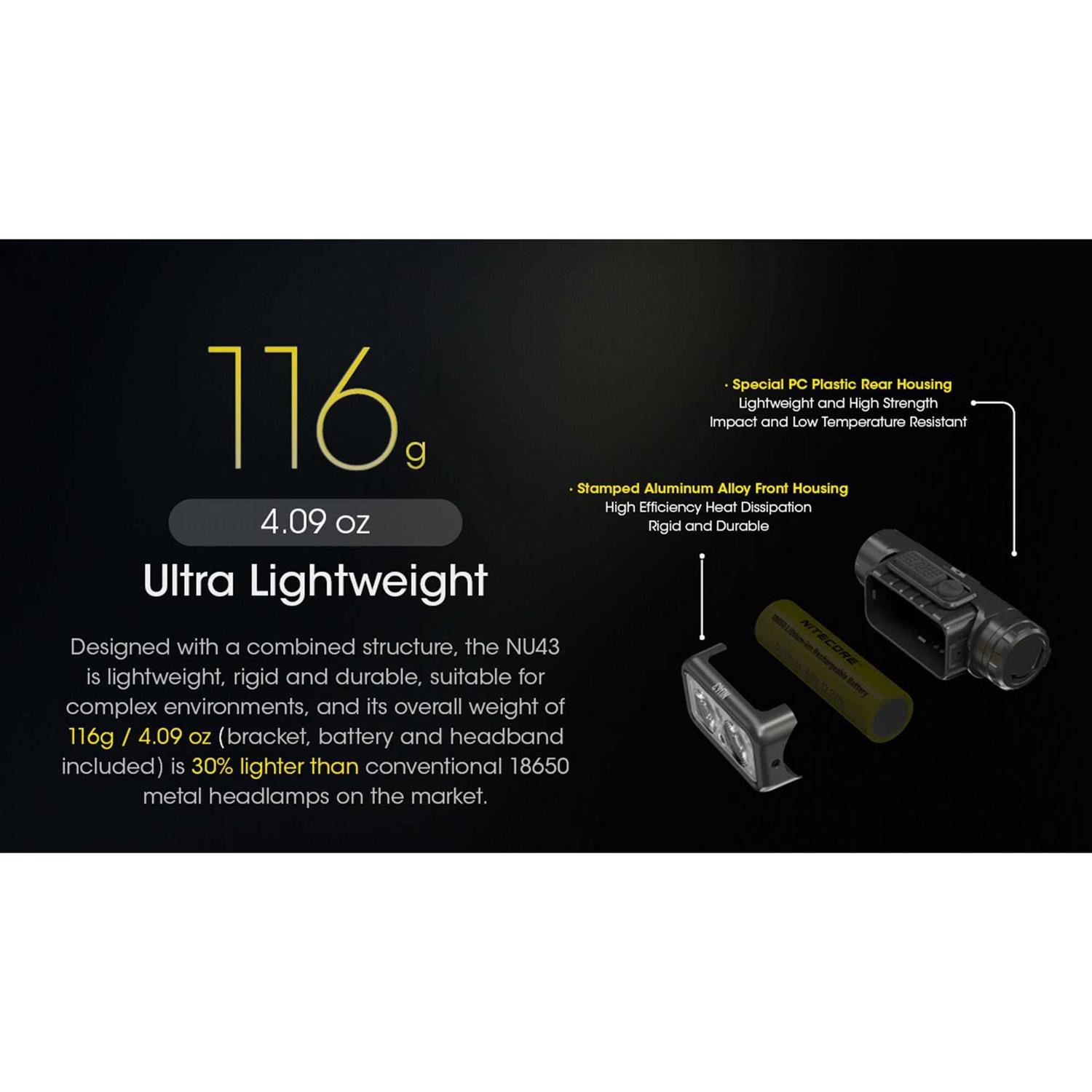- A little over 4 oz, Nitecore NU43 headlamp is capable of a 1400 lumen max with a beam throw of over 142 yards. USB-C RECHARGEABLE.