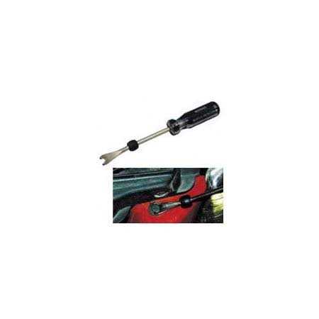 Upgrade your tool kit with this Plastic Fastener Remover. It’s specially designed for use on weather stripping, radiator shrouds, fender linings, air dams and a variety of other plastic or rubber parts. This automotive tool also has a button to protect the surface of the vehicle, and the button slides to provide added leverage. Additionally, the ergonomic handle is contoured to provide a secure and comfortable grip.