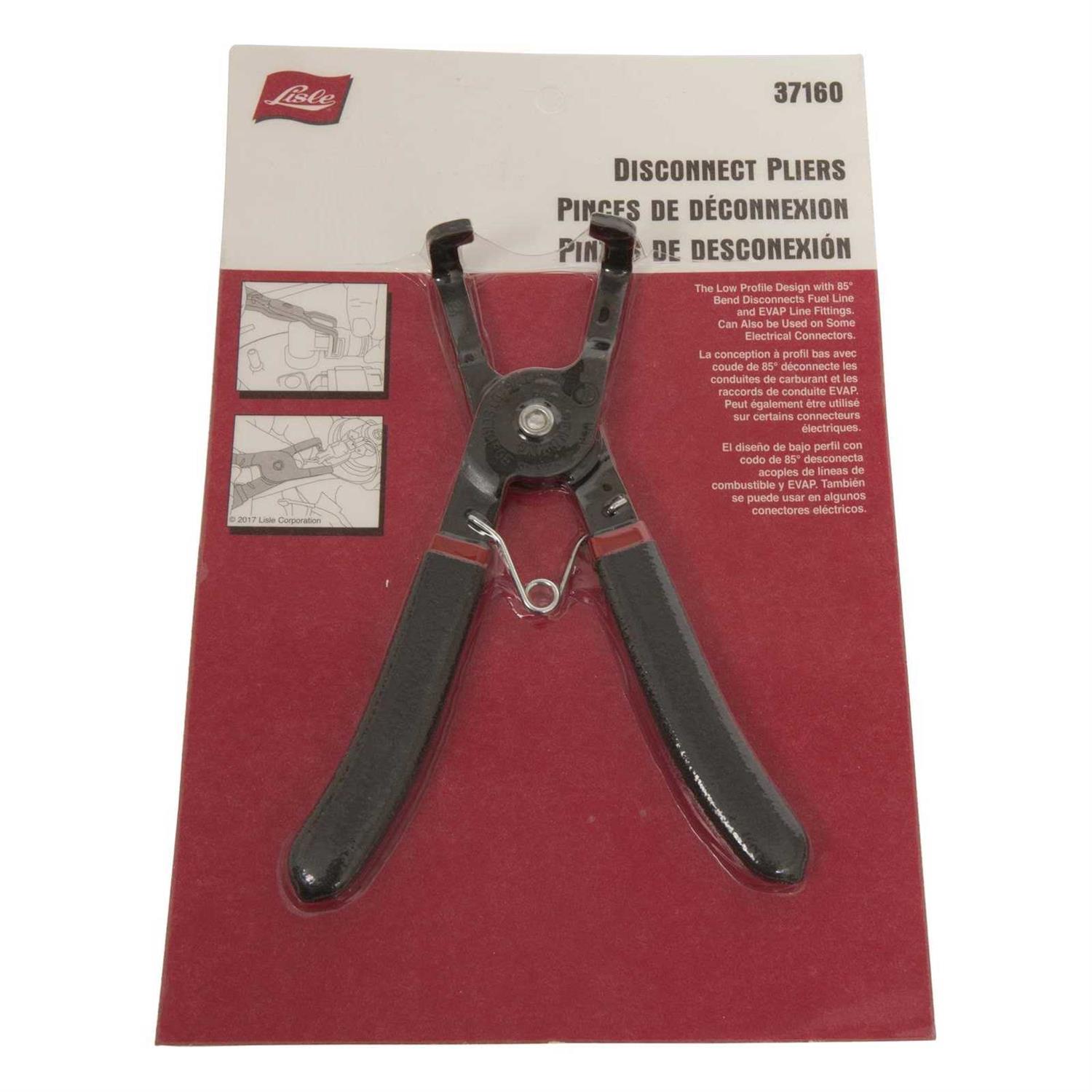 Lisle 37160 Disconnect Pliers Disconnects fuel line and EVAP line fittings with tabs that must be depressed to disengage. Spring action makes tool easier to use. Product Features Low-profile design with 85 degree bend allows the tool to fit between the top of the fuel tank and vehicle. Works great on Delphi two Tab connectors and some import vehicles. Can also be used on some electrical connectors.