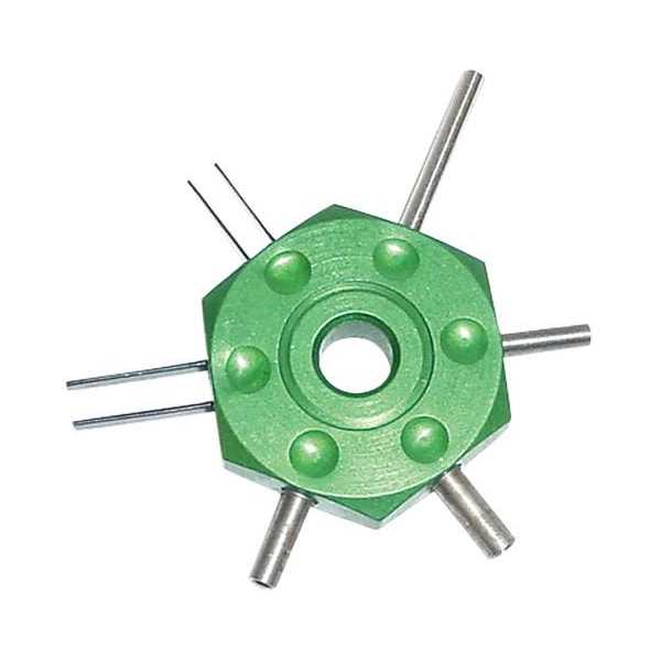 Designed to help the mechanic remove wires easily from terminal blocks without damage to either the wire or terminal. Compact for ease in handling and fits most common sizes of terminal blocks of domestic makes and models plus some imports. The prongs extending from the starshaped tool depress the barbs on the wire fitting to allow removal from the terminal block.