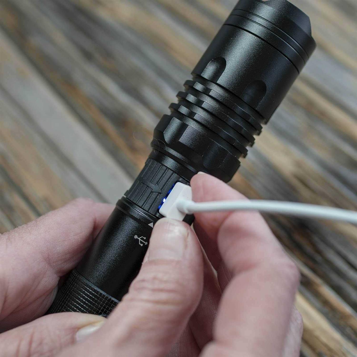• Flashlight recharges with a USB connector that plugs in to your computer, laptop or any A/C power.