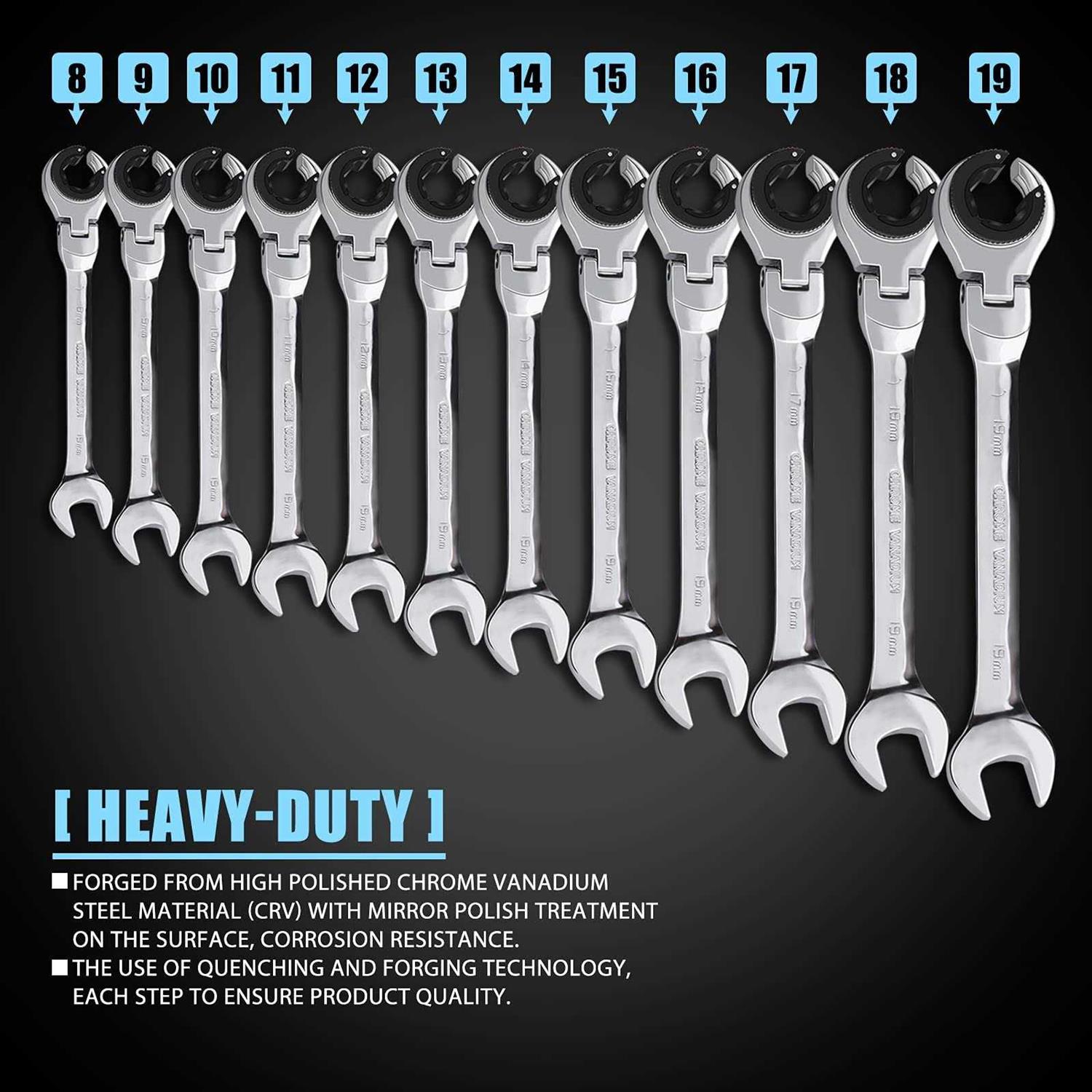【PATENTED DESIGN】 Ratchet tubing wrench open-end dedsign helps you to reach the tightest places, where most ratchet wrenches would not reach, convenient and quick. It allows for easy access and turning of hard to reach bolts. 【180°FLEX-HEAD & 72 TOOTH RATCHET】The slim profile with 180° flex is specially designed for working in tight spaces. Built-in 72 teeth, turning only once 5° s, easy to use a small space barrier and effortless operation 【12PCS METRIC SPANNERS】12 most frequently used sizes of the ratcheting wrench, including 8mm, 9mm, 10mm, 11mm, 12mm, 13mm, 14mm, 15mm, 16mm, 17mm,18mm, 19mm. 【HEAVY-DUTY】 Forged from high polished chrome vanadium steel material (CRV) with mirror polish treatment on the surface, corrosion resistance. The use of quenching and forging technology, each step to ensure product quality. 【APPLICATION】 This Tubing Ratchet Wrench is used to tighten hexagonal head, square head bolts or nuts, and can be widely used for auto repair and maintenance, mechanic repair, pipeline repair, electrician repair etc.”