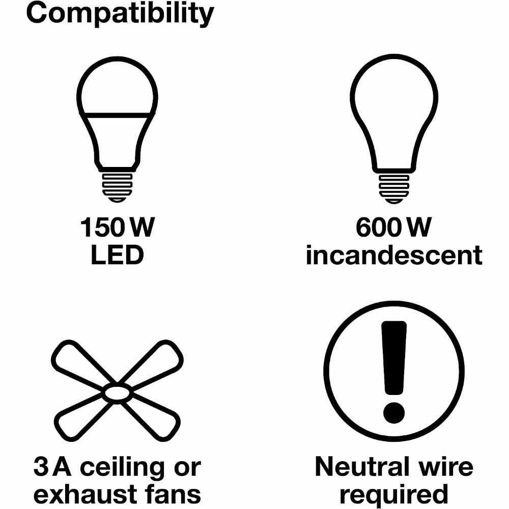 Lutron Maestro 1-Pole Preset countdown timer control switch in white color is an ideal choice for exhaust fans to minimize moisture mildew and mold in bathrooms/kitchens. It has advanced programming feature that allows user to customize their control to meet their specific needs. It has a voltage rating of 120 Volts and power rating of 600 Watts. It has a current rating of 5 Amps for ON/OFF lighting and 3 Amps for general fan purposes. Timer control switch has touch rocker to adjust countdown time. Timer control switch has a convenient option to set fan/light operations for 5 – 60 minutes before turning OFF automatically. Timer control switch must be tapped to turn ON/OFF and tapped twice for untimed ON. It warns one minute before turning lights/fan OFF. It measures 2-7/8 Inch x 1/4 Inch x 4-9/16 Inch. It operates at a temperature of 0 to 40 deg C and non-condensing relative humidity of 0 to 90%. It has an integrated LED in full ON state to indicate no timer action. It offers multi-location control to other companion switches. Timer control switch is UL listed and CSA certified.