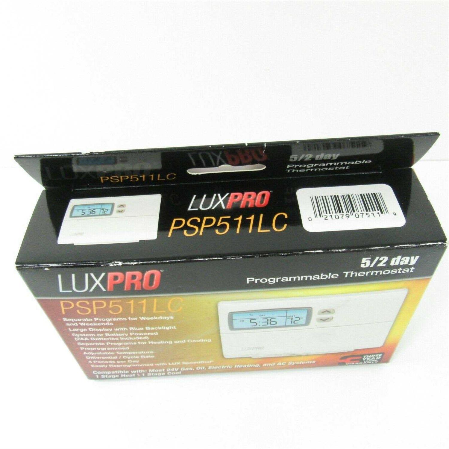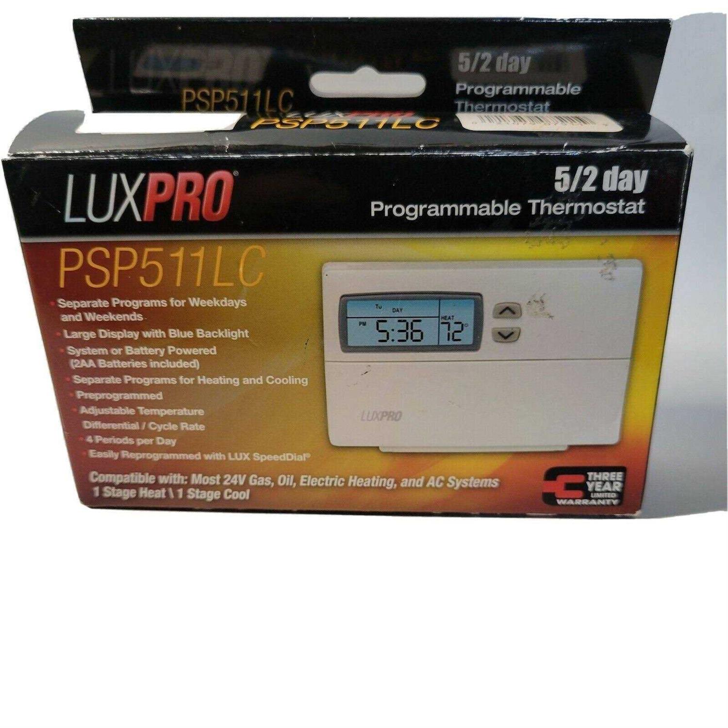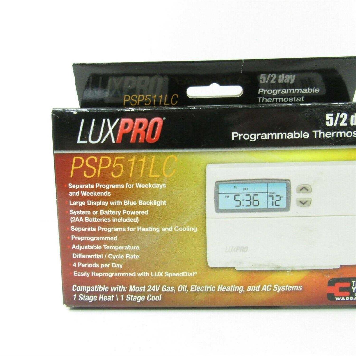Luxpro Psp511Lc Programmable Thermostat, 45 – 90 Deg F, 0.25 – 2.25 Deg F Differential, 1 Stages Heat, 1 Stages Cool, 4 Per Day, Lcd Display “Luxpro 1 Stages Heat/1 Stages Converts Programmable Thermostat In White Color Is Easy To Reprogram With Lux Programming Dial And Has Large Liquid Crystal Display For Better Clarity. It Can Be Preprogrammed Up To 4 Programs Per Day With 5 – 2 Days Programs Per Week And Has Separate Programs For Heating/Cooler Running. Features Separate Weekday/Weekend Programming And 5 Min Air Conditioning Compressor Delay For Convectors. Either System Powered With Battery Backup Or Battery Powered For Better Performance. Offers Total Isolation Between System Power/Thermostat And Temporary/Constant Temperature Override. It Has Push-Button For User Interface And Can Be Mounted Horizontally. Controllers In 45 – 90 Deg F With 0.25 – 2.25 Deg F Differential Temperature. Compatible With Most Single Stage 24 Volt Gas, Oil, Electric Heating And Air Conditioning Systems Including Single Stage Heat Pumps. Suitable For Use With 2-Wire Hydronic Systems, Millivolt Systems And Hydronic Air Handlers. It Measures 4-1/2 Inch X 3-1/4 Inch X 1-1/4 Inch And Has A Voltage Rating Of 24 Vac. It Has Rh, Rc, Y, W, G, C, O, B Terminal Designations. Thermostat Is Energy Star Certified.”