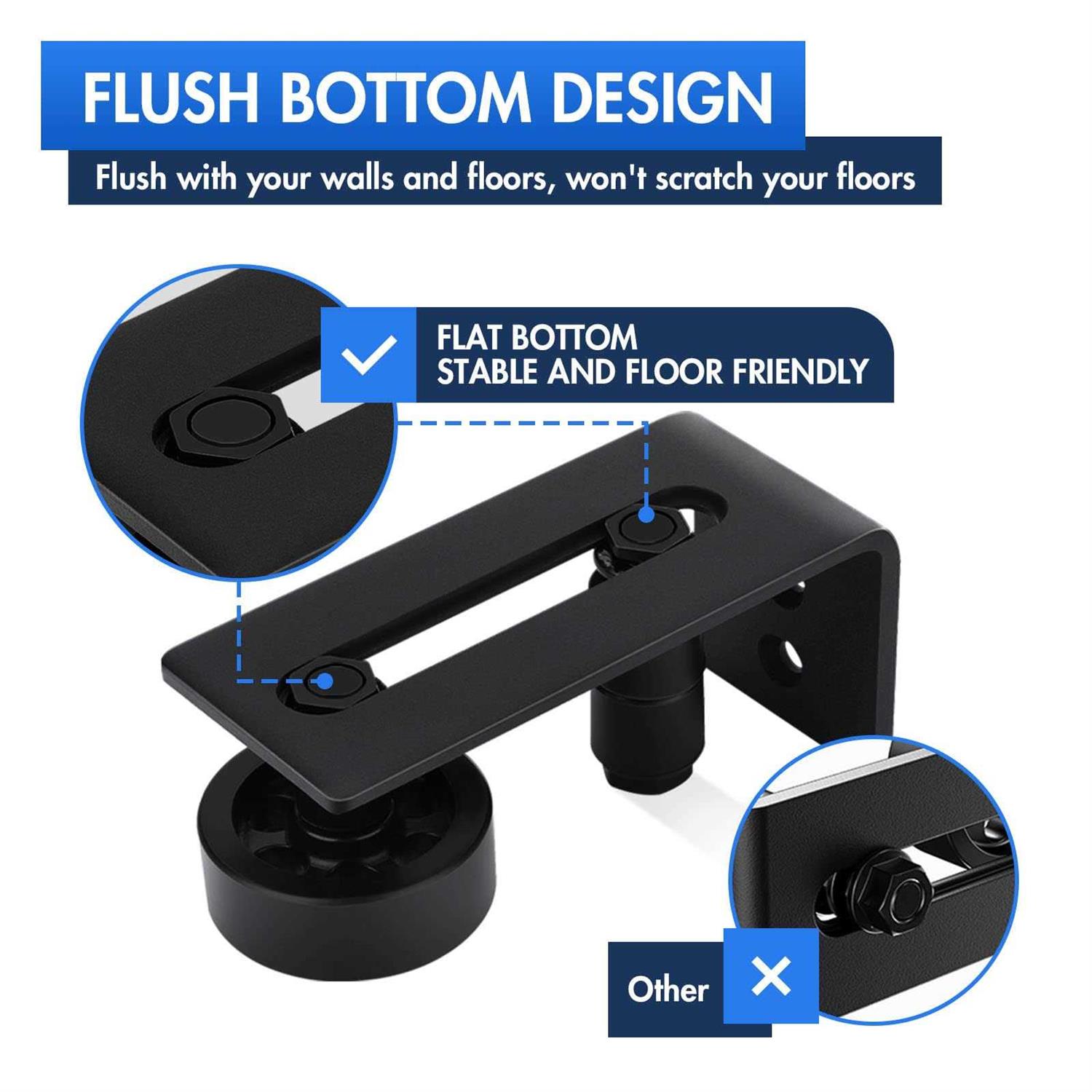 HUMANIZED DESIGN – The bottom is flush with the floor design, and the wall-mounted design can adjust the installation height according to the position of the barn door; 8 combinations are suitable for barn doors of various thicknesses (maximum 3.5inch). SOLID AND MUTE – The steel has strong forging stability and wear resistance, and has a good matte black texture. The felt is attached to the roller to prevent the sliding friction from damaging the barn door, and the silent sliding is smoother. EASY TO INSTALL – The barn door guide is equipped with wrenches and installation manual, and the floor guide can be combined in various ways to meet various needs in various scenarios.