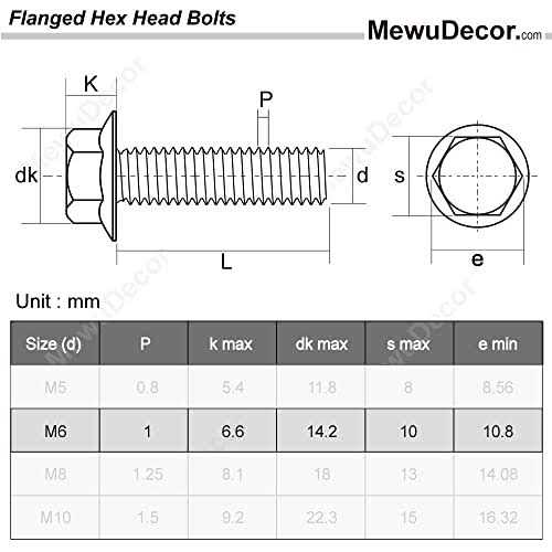 High quality Grade A2-70 Stainless Steel 18-8 (304) provides strength and offers good corrosion resistance in many environments. Flange bolts have a flange on the bottom of the head that distributes the load like a washer. Thread Diameter 6 mm, Thread Size 1.0 mm (M6), Screw Length 16 mm. Package Included: 50 PCS Flanged Bolts. Flanged Bolts are great to have around for use in wood and wet environments.