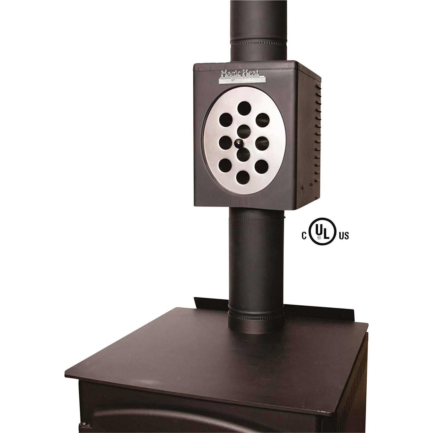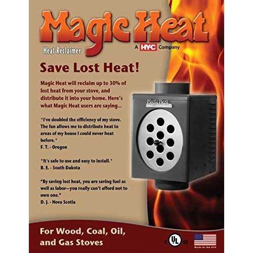 Magic Heat is the only UL listed heat reclaimer on the market. Magic Heat reclaims up to 30 percent of lost heat from your heating appliance and distributes it into your home using only .31 amp of power, roughly equivalent to a 40 watt light bulb. Magic Heat is designed for heating appliances with inside flue temperatures exceeding 350 degrees and surface temperatures of the single wall pipe below the Magic Heat exceeding 280 degrees. The bottom crimp design makes this unit ideal for wood burning heating applications by containing any creosote within the chimney. A toggle switch allows the 225 CFM fan to operate in two modes. Either run continuously or a preset thermostat automatically turns the blower fan on when the Magic Heat casing reaches 150 degrees and off at 120 degrees. Magic Heat is easy to install and must be installed between 12 and 24 inches from the appliance flue outlet using a single wall connector pipe. Magic Heat is available in 6, 7 and 8 pipe diameters for wood ,oil, coal, or natural gas burning heating appliances. Manufactured in the USA.