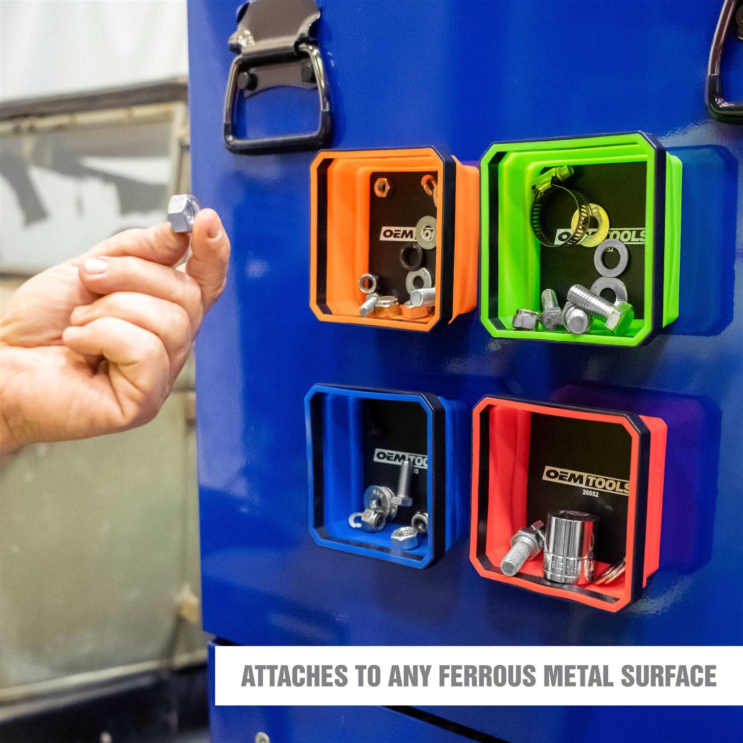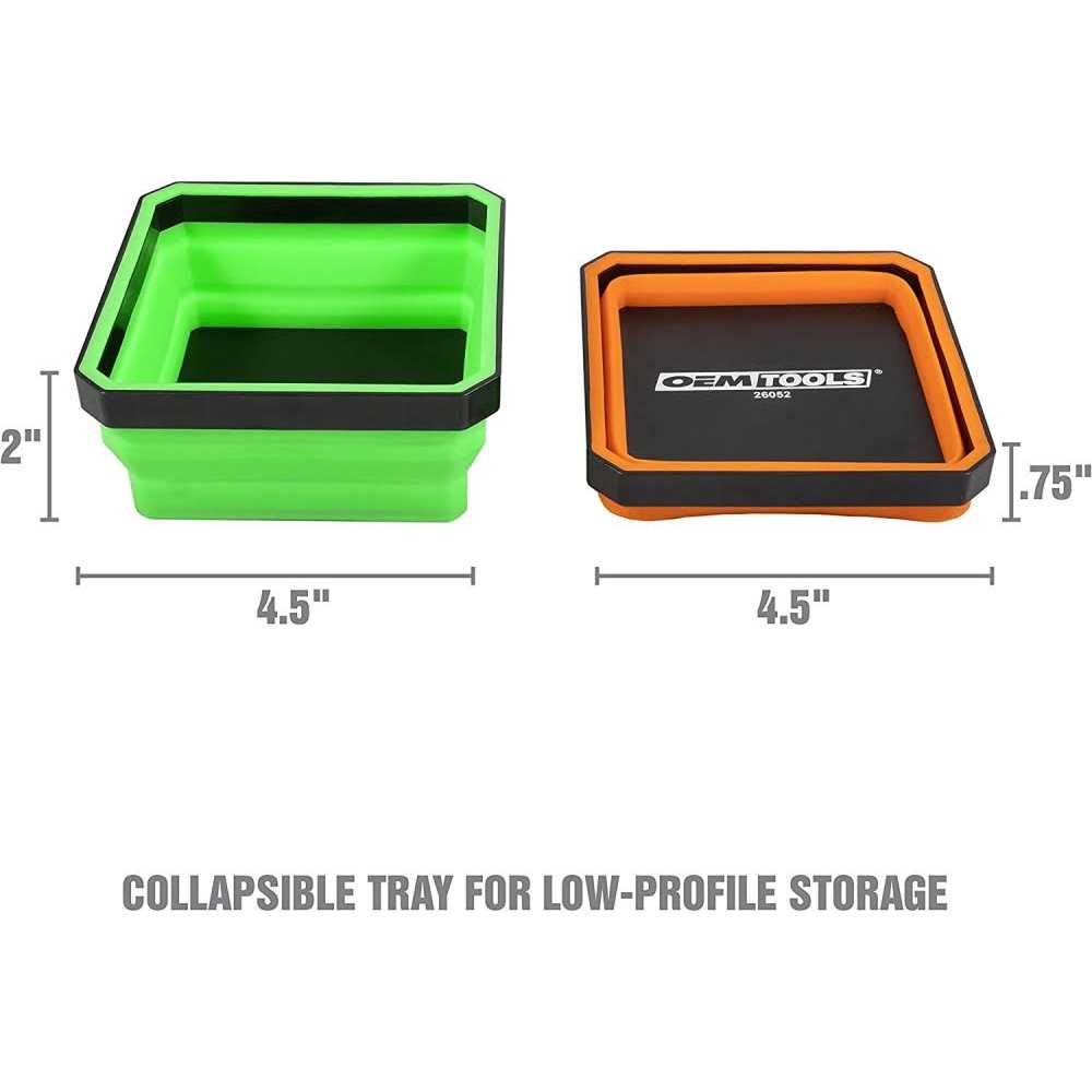 The OEMTOOLS Magnetic Foldable Tool Tray set is comprised of four collapsible silicone trays for effective storage of hardware and other tools. One magnetic nut and bolt tray set includes four trays in red, orange, green, and blue silicone, respectively. A multicolored set of storage trays allows for intuitive organization of your tools and hardware. The trays feature a strong magnetic base that attaches to any ferrous metal surface, and can be secured at any angle. A magnetic bottom doesnt just allow your magnetic tool holder to stick to surfaces, but ensures that metal hardware stored in your magnetic cup are secure, even when placed at an odd angle while you work. The collapsible silicone bowls are made of non-marring material, so you wont need to worry about scratching any finished surfaces. High tensile silicone gives the trays a longer shelf life and makes them resistant to damage from liquids, adding durability to their design. When fully extended, the trays can measure up to 2 inches deep, and can handle up to 2 pounds of hardware. The collapsible feature of these trays also allows for a low-profile organizational system, so the tool trays dont get in your way as you work.