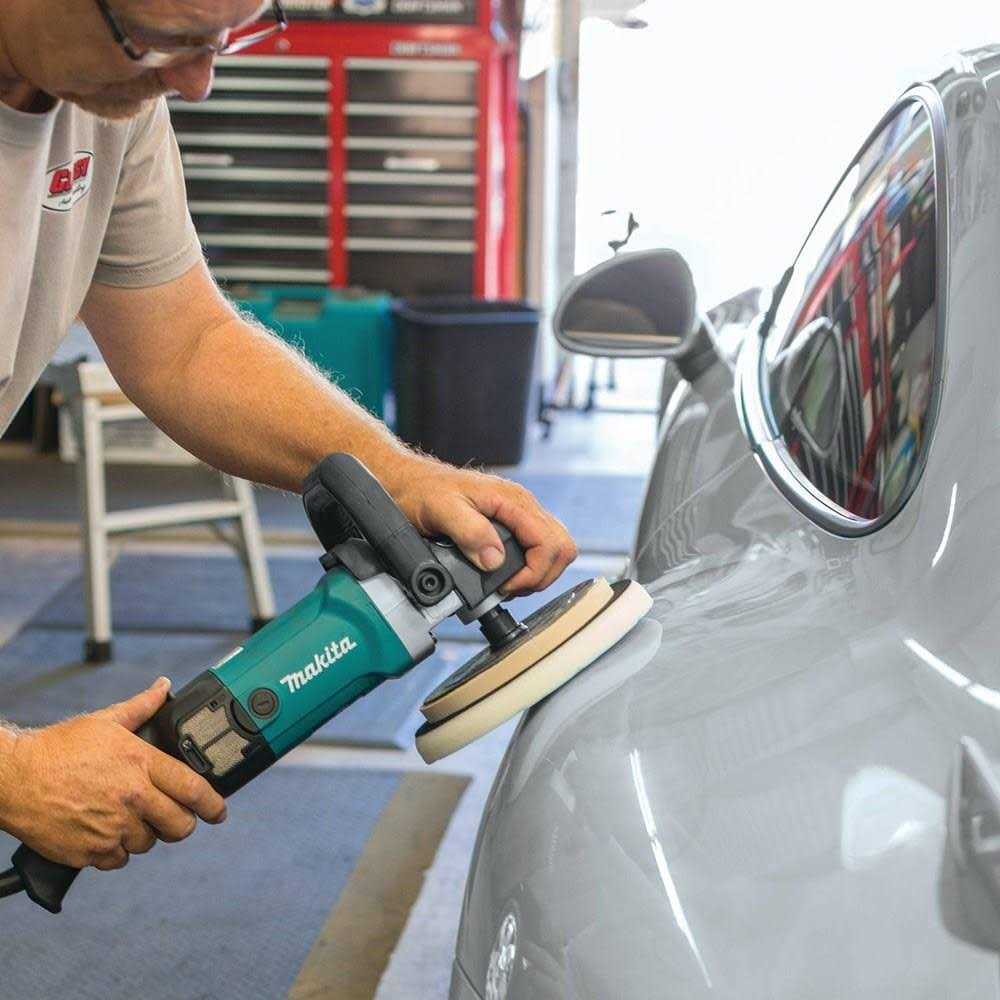 The Makita 7-inch polisher outlasts any smoothing or polishing work, with a high-powered motor and improved safety and accessibility features to create the ultimate polishing tool. Featuring a motor capable of up to 3,000 rpm, this tool uses a variable-speed control to match its power to your work, delivering smooth, clear surfaces. This Makita variable speed polisher also features soft-start technology to extend the life of its gears and help stop accidental discharge and material fling as it starts up. The design’s wire-mesh intake covers and cord guard maximize your motor’s life and your tool’s safety, with both features reducing working hazards as you polish. A built-in lock-on functionality and set of rubberized handle allow hours of work with your Makita electric polisher without wearing yourself out.