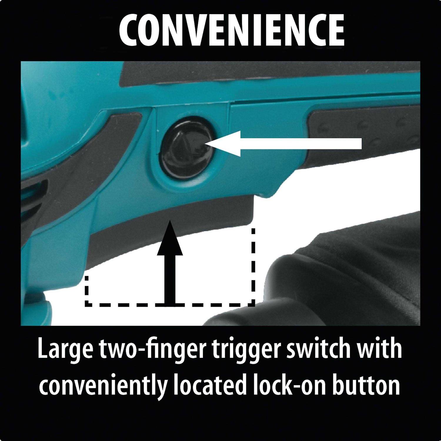 - Large two finger trigger type switch with conveniently located lock on button for continuous use