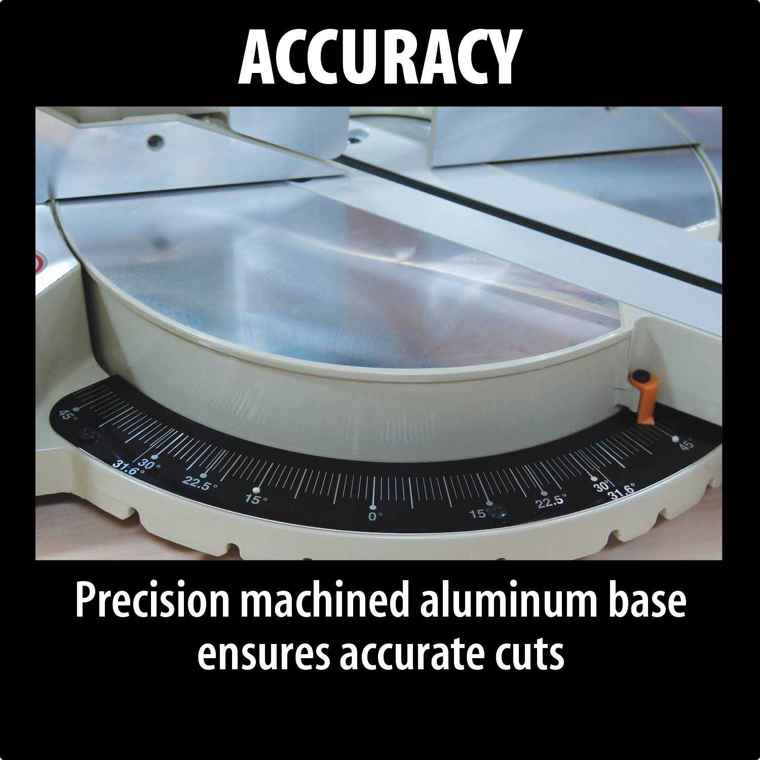• Positive miter stops at 9 settings; 15°, 22.5°, 31.6°, 45° right or left and 0° (90° cuts)
