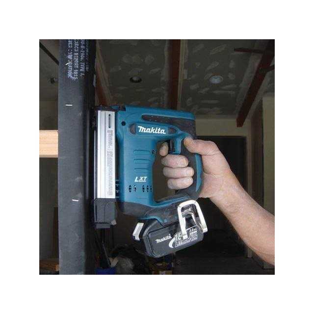 The Makita 18V LXT Lithium-Ion cordless 3/8 in. Crown stapler (model XTS01Z, tool only) is a true utility stapler engineered for a range of trades. The XTS01Z is compact and powerful, and can drive a wide range of 3/8 in. crown staple lengths flush into hardwoods like oak, maple, cherry, and more. For improved tool performance and extended battery life, Makita created STAR Protection computer controls. STAR Protection is communication technology that allows the star Protection-equipped tool and battery to exchange data in real time and monitor conditions during use to protect against overloading, over-discharging and overheating. For increased versatility, the tool can also be powered by Makita 18V LXT and compact Lithium-Ion batteries with the star symbol on the battery indicating STAR Protection inside. The XTS01Z will drive 1/4 in., 3/8 in., 1/2 in., 9/16 in., 5/8 in., 3/4 in., and 7/8 in. length staples (3/8 in. crown); and will also utilize arrow T50 type staples for maximum versatility. The easy-to-use depth control setting can be adjusted with a single knob. The rugged machined aluminum magazine ensures smooth loading and feeding of staples, with a convenient window on the magazine that shows the number of remaining staples. The spring-loaded driving mechanism allows for a more compact tool with less weight: it weighs only 5.3 lbs. (with battery, sold separately) at just 9-7/8 in. in length. The ergonomic shape fits like a glove with even pressure and easy control, and the soft grip handle provides increased comfort on the job. The XTS01Z is engineered for a range of stapling tasks including drywall, roofing, furniture, upholstery, and utility installation. It can even be used in a production environment for exterior framers to apply house wrap. It is perfect for residential construction, remodeling, woodworking, cabinetry, or for any pro contractor who requires a best-in-class engineered cordless 3/8 in. Crown stapler.