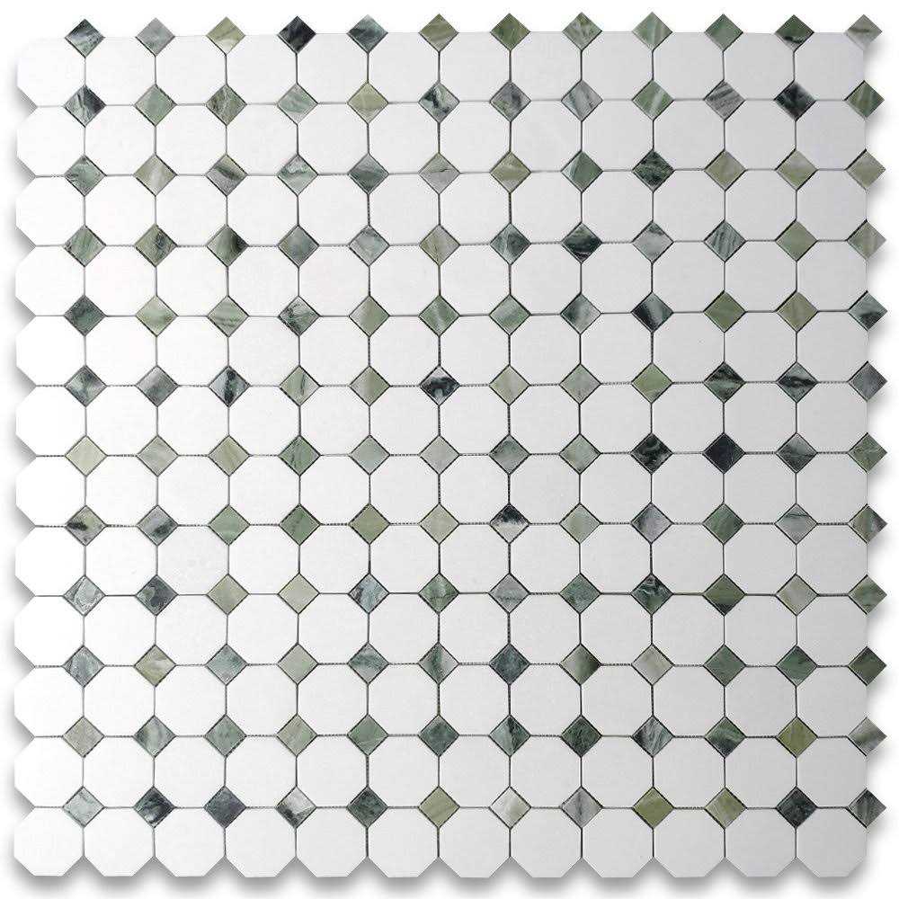 Premium Grade White Thassos Marble Octagon Mosaic Tiles w/ Sagano Green Dots. Greek Thassos White Pure White Crystal Marble Polished 3 inch Octagon Mosaic Wall & Floor Tiles are perfect for any interior projects. The 3 inch Thassos White Marble Octagon Mosaic tiles can be used for a kitchen backsplash, bathroom flooring, shower surround, dining room, entryway, spa. Our timeless Glossy White Thassos Marble Octagon Mosaic tiles with a large selection of coordinating products is available and include arabesque, fish scale, penny round, herringbone, basketweave mosaics, 12×12, 18×18, 12×24, subway tiles, moldings, borders, and more.