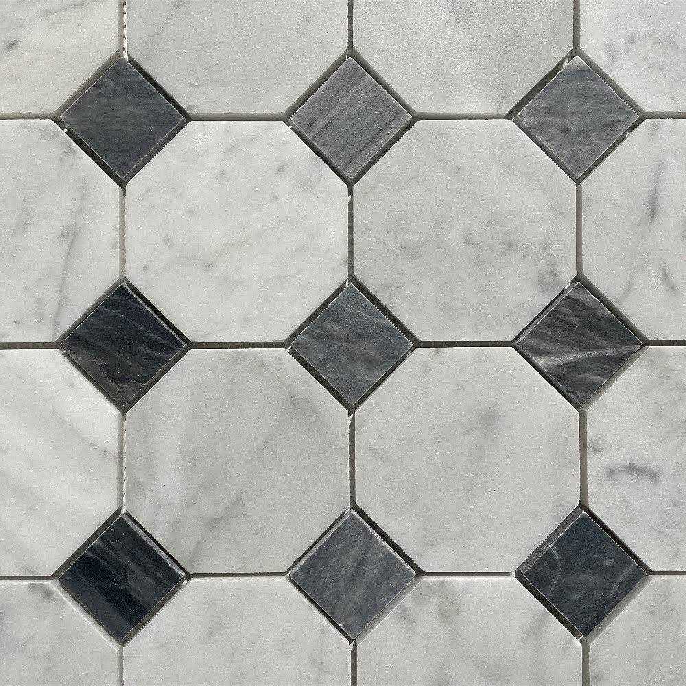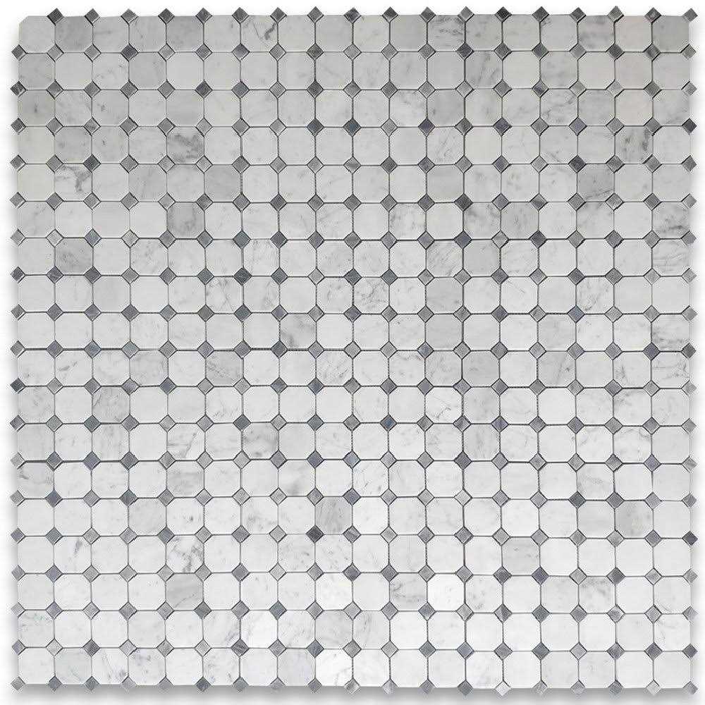 Premium Grade Carrara White Marble Octagon Mosaic Tiles w/ Bardiglio Gray Dots. Italian Carrara Venato Bianco Carrera White Marble Polished 2-inch Octagon Mosaic Wall & Floor Tiles are perfect for any interior project. The 2-inch Carrara White Marble Octagon Mosaic tiles can be used for a kitchen backsplash, bathroom flooring, shower surround, dining room, entryway, or spa.
