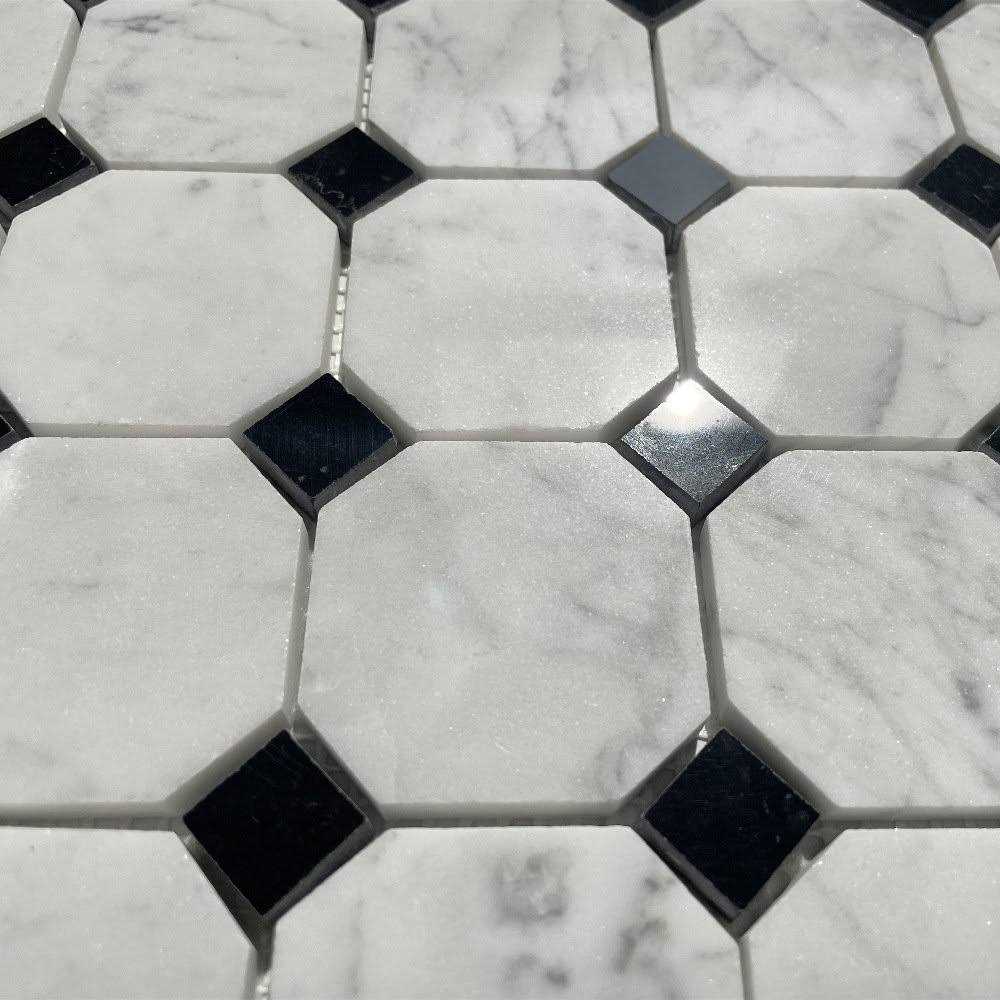 - Carrara White Marble 2″ octagon pieces and Nero Marquina 3/8″ dots mounted on 12×12″ sturdy mesh tile sheet