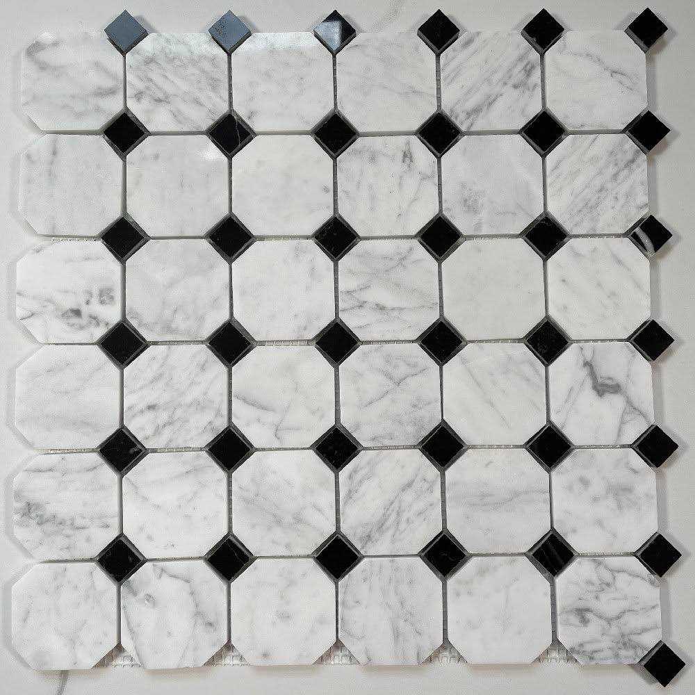 - Carrara White Marble 2″ octagon pieces and Nero Marquina 3/8″ dots mounted on 12×12″ sturdy mesh tile sheet