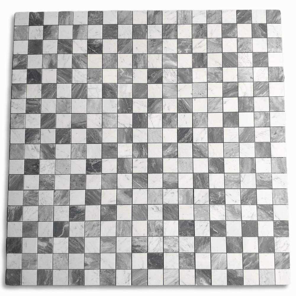 Marble Online Premium Grade Carrara White & Bardiglio Grey Marble Checkerboard Mosaic Tile. Carrara White Marble Italian Venato Bianco Carrera & Bardiglio Grey Marble Polished 2×2 Checkerboard Mosaic Wall and Floor Tiles are perfect for any residential / commercial projects. 2×2 Checkerboard Mosaic Tiles can be used for kitchen backsplash, bathroom flooring, shower surround, dining room, entryway, corridor, spa, etc. Our timeless Glossy White Carrera & Grey Bardiglio 2×2 Checkerboard Grid Mosaic Tile with a large selection of coordinating products is available and includes hexagon, herringbone, basketweave mosaics, 12×12, 18×18, 24×24, subway tile, mouldings, borders, and more. Colour: White/Grey