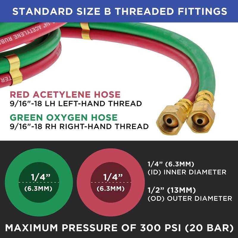 A durable, flexible twin hose set designed for transporting oxygen and acetylene gases to your welding torch, brazing, soldering, and cutting equipment. These R-grade long-lasting hoses are ideal to use while working on all of your metalworking projects. Both the oxygen hose and acetylene gas hose have a 1/4-inch (6.3mm) (ID) inner diameter and a 1/2-inch (13mm) (OD) outer diameter and have a maximum pressure of 300 PSI (20 Bar) to supply an optimal flow rate. The hose set has a color-coding system, so you can distinguish that the green hose is for oxygen and the red hose is for acetylene, and this will ensure safe and accurate connections to your regulator and oxy torch. All four hose ends of the twin welding hose set come with standard size B threaded fittings. The fitting sizes are 9/16″-18 LH left-hand thread for the red acetylene hose and 9/16″-18 RH right-hand thread for the green oxygen hose, which enables the hoses to connect onto existing standard regulators and torches. The 25-foot (7.6m) long torch hoses enable you to safely keep the tanks away from the torch tip while in use. The welding hoses are long enough for mechanics shops, production line welding, and other indoor and outdoor construction, industrial, and agriculture uses. Our durable, flame retardant, flexible twin welding hoses are fused together and are resistant to kinking, cracking, abrasion, and weather, unlike other hose sets that easily crack or leak, creating a fire hazard. They stay flexible in extreme temperatures from -4°F to 158°F, making them ideal for long-term use. Six zip ties included.