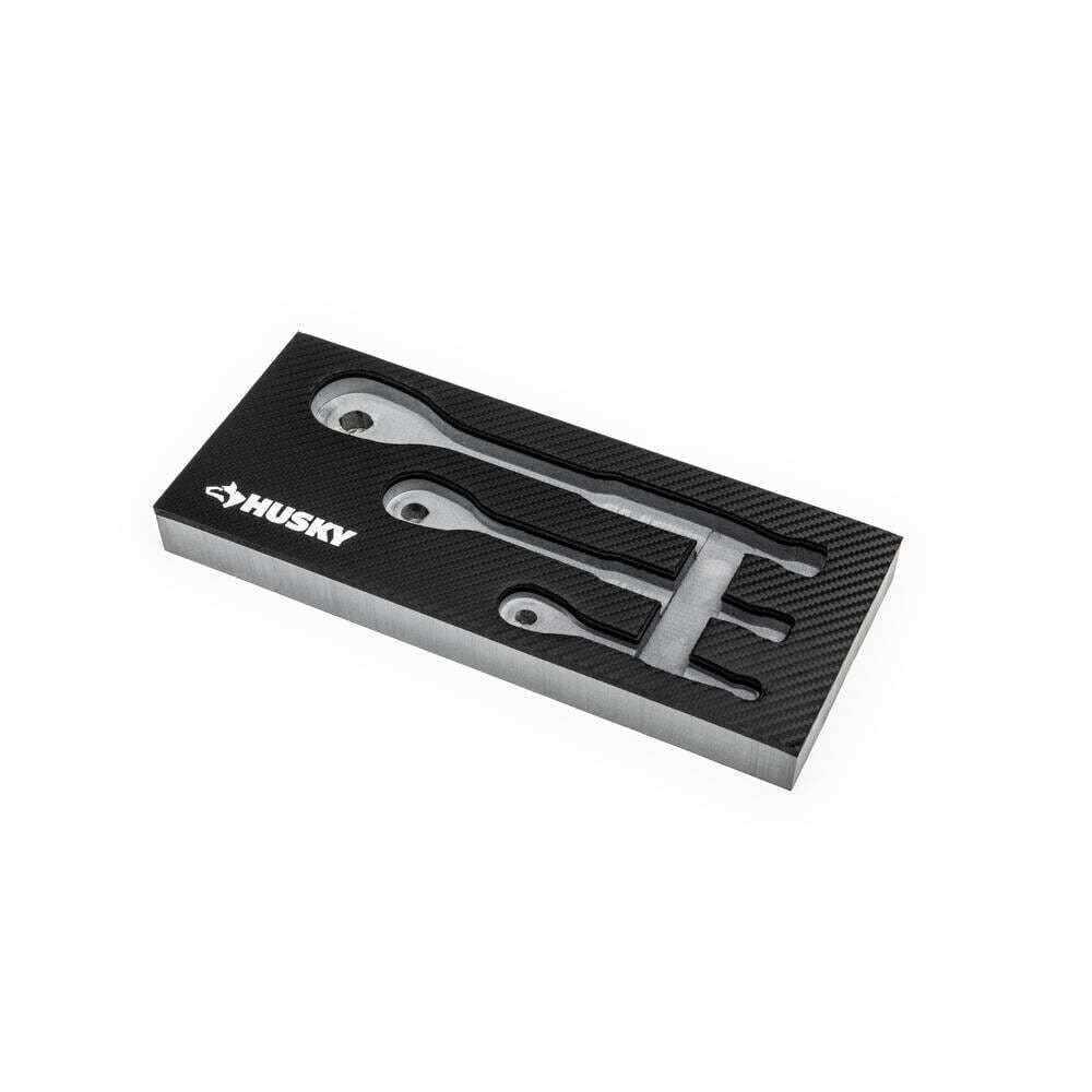 Drive 72-Tooth Ratchet Set in EVA includes 3 ratchets (one in each drive size) conveniently stored in the EVA foam tool tray. Husky Ratchets are made of alloy steel to provide excellent durability. The ratchet set includes a 1/4 in. drive ratchet, a 3/8 in. drive ratchet and a 1/2 in. drive ratchet with 72-tooth quick release heads that need only a 5 degree arc swing to turn a fastener. The ratchets have a low profile teardrop style head to allow for quick and easy access to nuts and bolts in tight locations. Ratchets also feature a flush mounted reversing lever, providing a quick transition from loosening to tightening. The EVA foam tray acts as a ratchet organizer which allows for stylish organization in your garage or tool chest.
