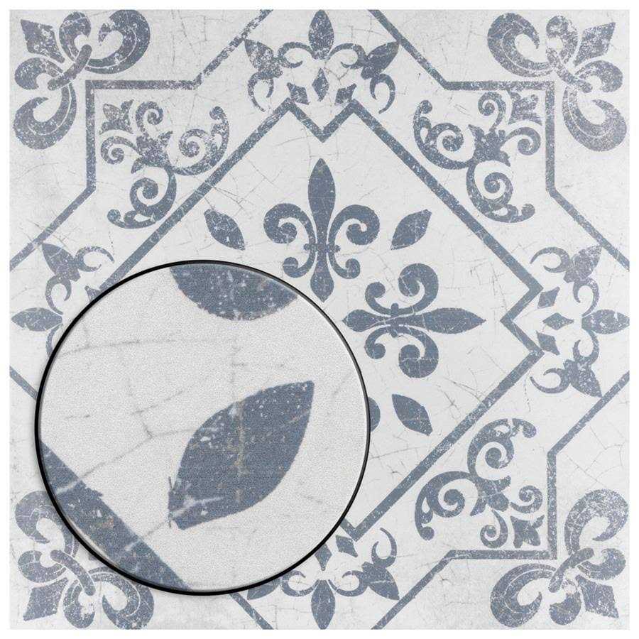 With a crackling cool white surface, this Spanish tile rivals antique, old-world design. Slate blue lines diagonally intersect, creating sharp angles and offset framing patterns. Set within the center diamond are four fleur-de-lis configurations, creating an appealing, elegant centered design. Flourishing patterns in the four corners further express its encaustic inspiration. All of these patterns are distressed, convincing that this tile is truly aged. The medium-sheen finish further convinces that this is an age-old tile. This durable tile is suitable for most interior installations, including kitchens, bathrooms, and showers. Tile is the better choice for your space. This tile is made from natural ingredients, making it a healthy choice as it is free from allergens, VOCs, formaldehyde and PVC.