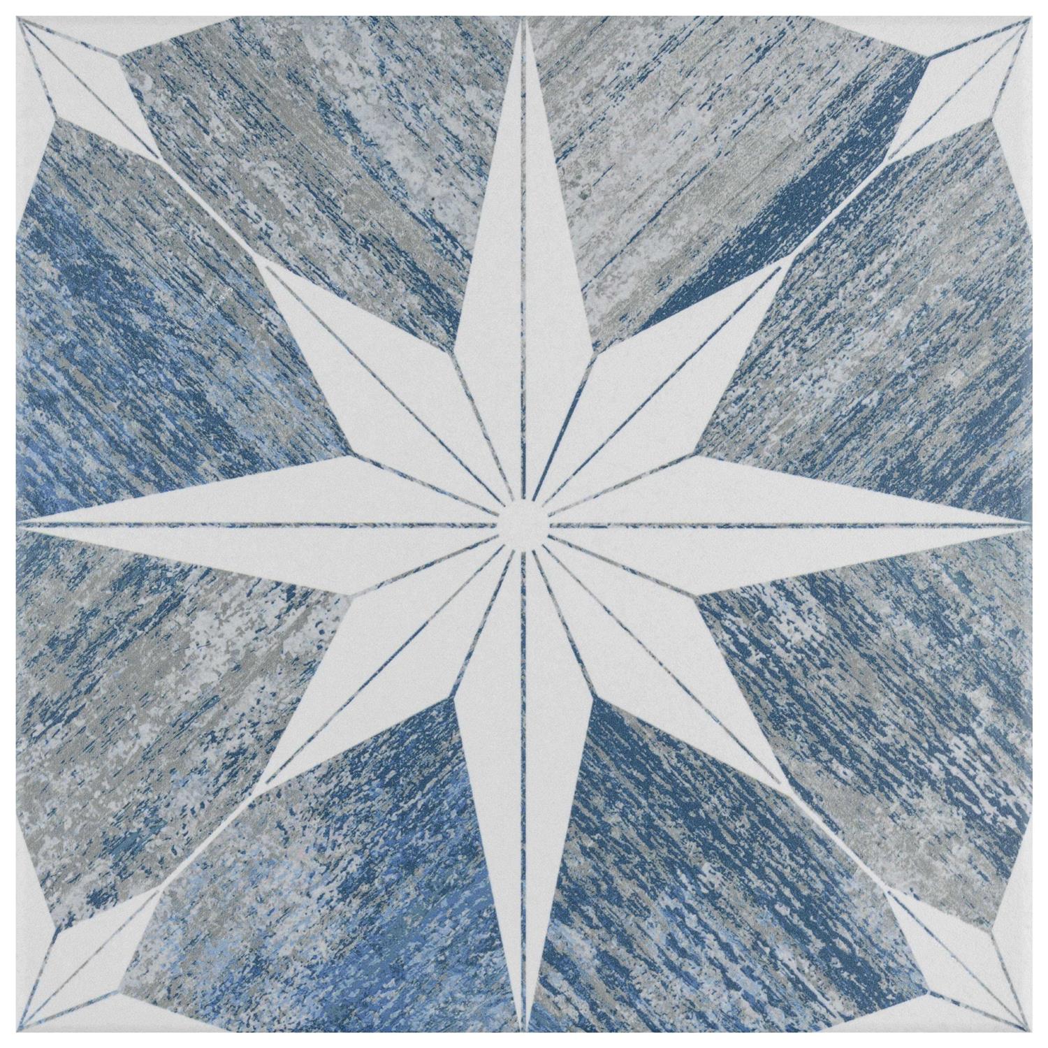 Blending texture and pattern, our Cassis Stella Blue Day Porcelain Floor and Wall Tile mimics the natural appearance of distressed wood and timeless old-world beauty. This square porcelain tile features a large geometric star pattern in faded denim blue and light grey wood tones. Composed of rich detail and a textured, mixed finish surface, this floor and wall tile features stunningly realistic woodgrains and striations for additional visual dimension. Available in 10 print variations that are randomly scattered throughout each case, this porcelain tile can be laid out in various different patterns to create a truly unique installation. Its impervious and frost-resistant features make this an ideal choice for indoor and outdoor residential installations including, including backsplashes, bathroom floors and walls, showers, kitchen floors and walls, fireplaces and patios.