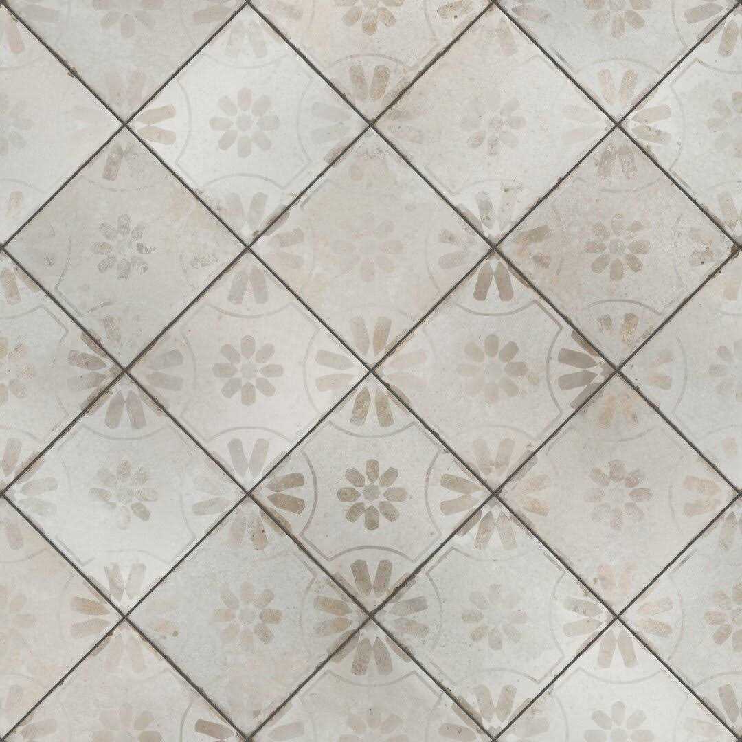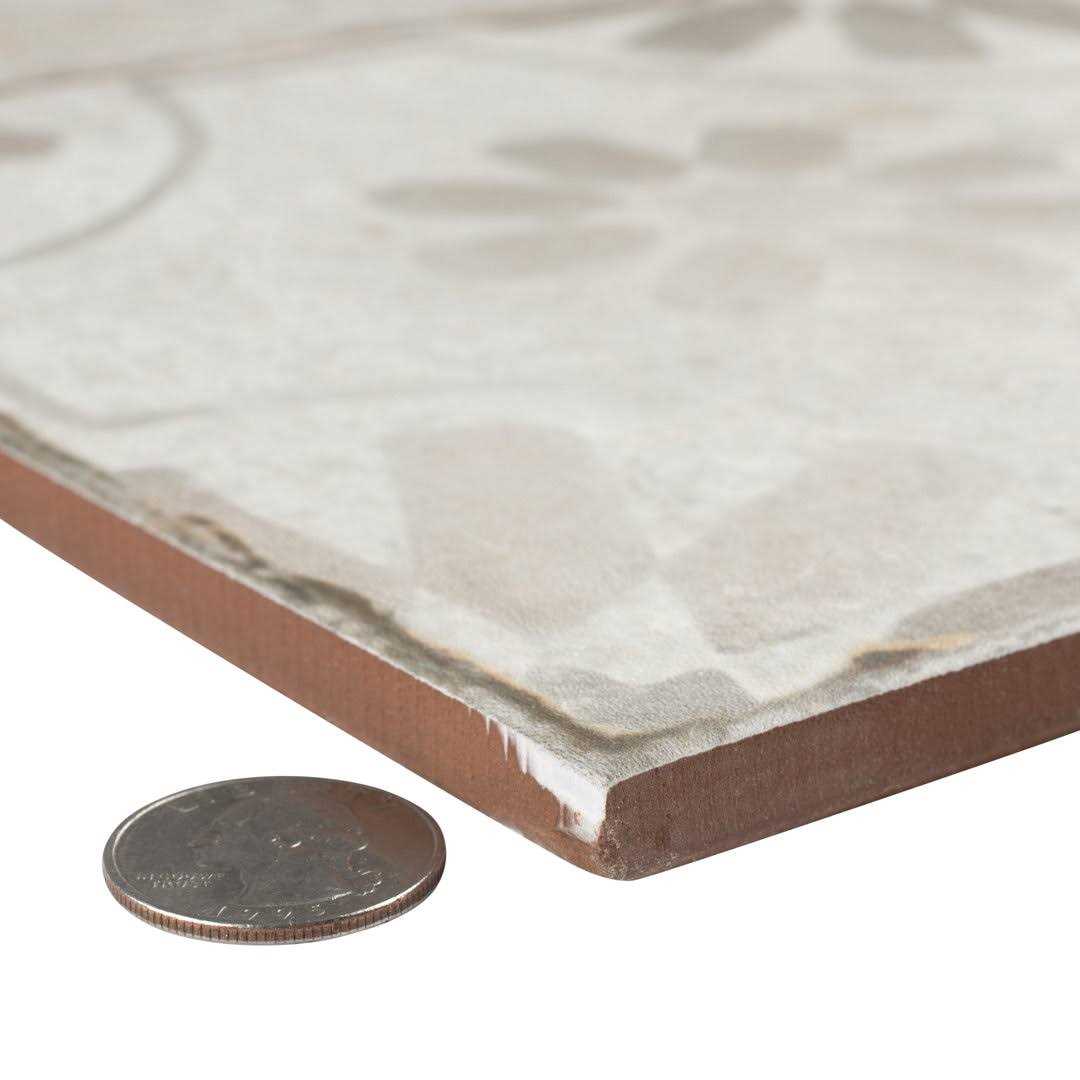 Modern and vintage design elements blend together to create our Royalty Daisy 17-5/8 in. x 17-5/8 in. Porcelain Floor and Wall Tile. Featuring a worn cement appearance, this tile is a subtle statement piece created by floral motifs in faded shades set on an base glaze. Designed by interior architect and furniture designer Francisco Segarra, this tile is a true reflection of vintage industrial design. Realistic imitations of scuffs and spots that are the marks of well-loved, worn, century-old tile bring rustic charm to any interior setting. These rustic scuffs and spots convince that this tile is truly aged. Available in 7 print variations that are randomly scattered throughout each case, the variation throughout each tile mimics an authentic aged appearance. Save time and labor spent arranging smaller square tiles and instead install these durable porcelain slabs, which have four 8-3/4 in. squares separated by scored grout lines. The scored grout lines can be grouted with the color of your choice, or left ungrouted for a rugged finish. Its durable, ADA-compliant and glazed features make this tile an ideal choice for indoor residential use, including kitchen backsplashes, bathrooms and showers.