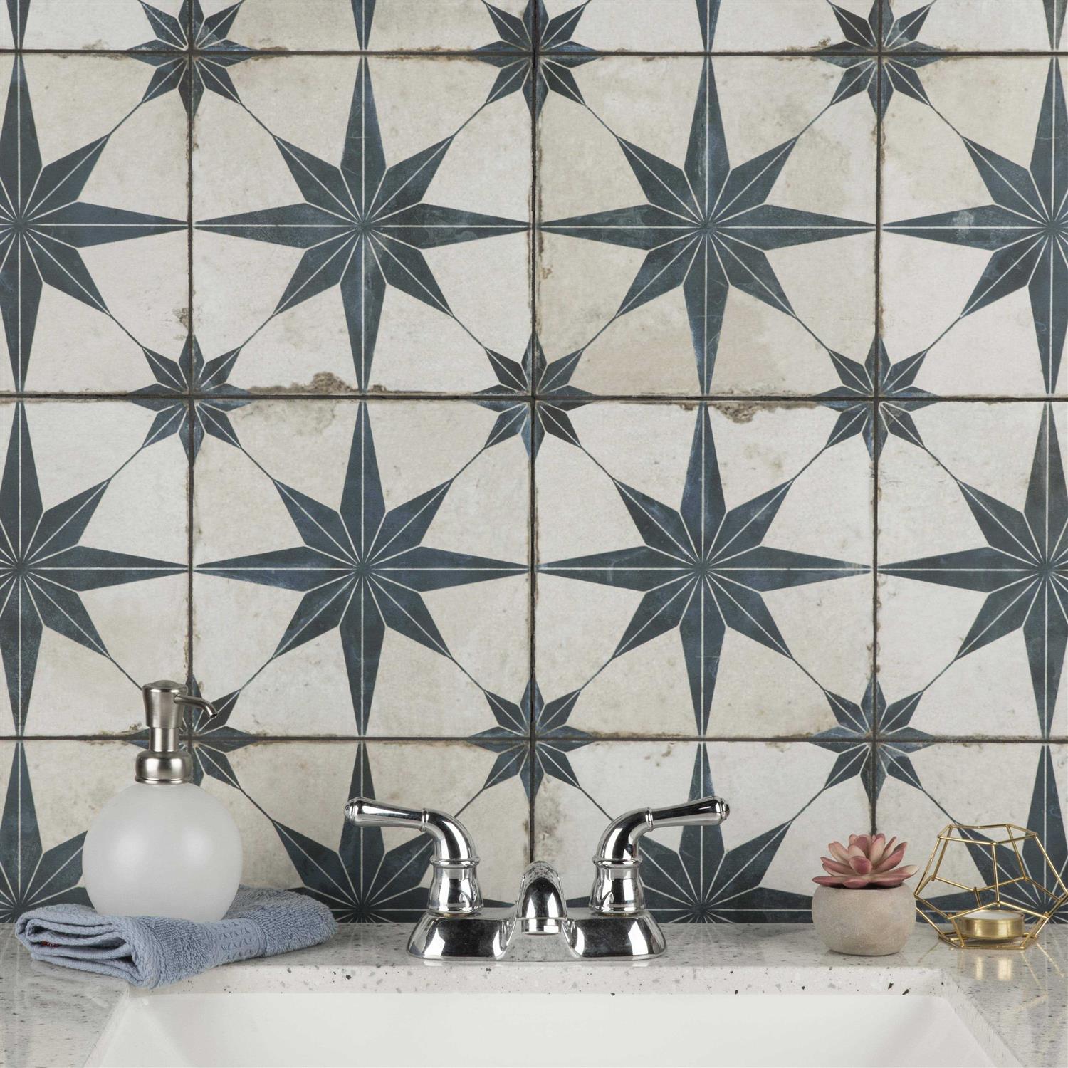 Save time and labour spent arranging smaller square tiles and instead install these durable ceramic slabs, which have four 8-3/4 squares separated by scored grout lines. The defining feature of this encaustic-inspired tile is the unique, low-sheen glaze in beige tones with centered royal blue-coloured stars in each square. Variation throughout each tile mimics an authentic aged appearance. Designed by interior architect and furniture designer Francisco Segarra, this tile is a true reflection of vintage industrial design. Realistic imitations of scuffs are the marks of well-loved, worn, century-old tile bring rustic charm to your interior. There are nine different variations available that are randomly scattered throughout each case. The scored grout lines can be grouted with the colour of your choice, or left un-grouted for a rugged finish.