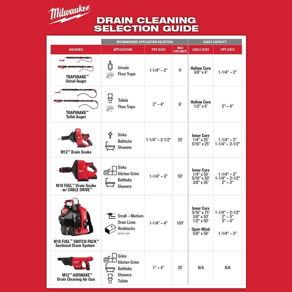 The M12 TRAPSNAKE Driver can power M12 TRAPSNAKE 4 Urinal Auger and the M12 TRAPSNAKE 6 Toilet Auger. As the first powered unit optimized for the challenges of porcelain fixtures, this unit delivers power and speed to work through tough clogs in tight traps, but has optimized electronics that protect the fixture from the auger and allow the user to feel when it is engaged with a blockage. Users can interchange the M12 TRAPSNAKE Driver with the TRAPSNAKE Auger Handle, or use with other auger attachments for versatility and capabilities never seen before in a toilet or urinal auger.