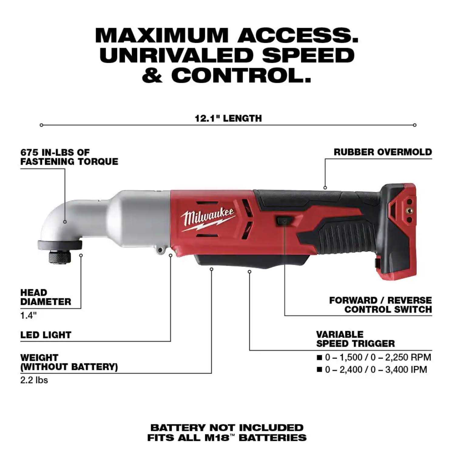 This M18 series cordless impact driver with a right angle handle has a brushed motor that operates on an 18V lithium-ion battery of 4 Ah. It has a -inch hex quick change straight drive, maximum torque of 675 in-pounds, free speed of 2250 RPM, and 3400 IPM. The driver includes the bare tool. It features built-in LED lights and an extended paddle switch.