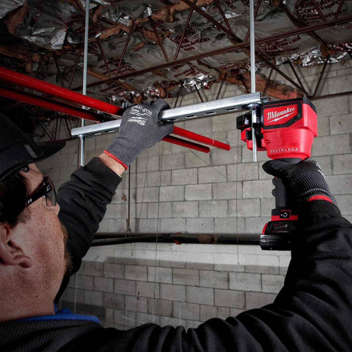 Our M18 Brushless Threaded Rod Cutter is Milwaukee’s dedicated solution for cutting the most common threaded rod sizes on the job site. The cordless threaded rod cutter is powered by a brushless motor and delivers 400 plus cuts while powered by an M18 Redlithium 2.0Ah Battery. The all thread cutter has the clearest line of sight and delivers clean, burr free cuts enabling you to thread a nut on by hand without having to file down the ends. The rod cutter features optimized blade geometry and cut speed to prevent chips and sparks while cutting. It has auto jaw opening allowing you to perform fast, repetitive cuts while a reverse button helps prevent unintended cuts. Its centered grip provides the best balance for one-handed overhead trims, while the flat horizontal design provides you with a stable surface for benchtop cuts.
